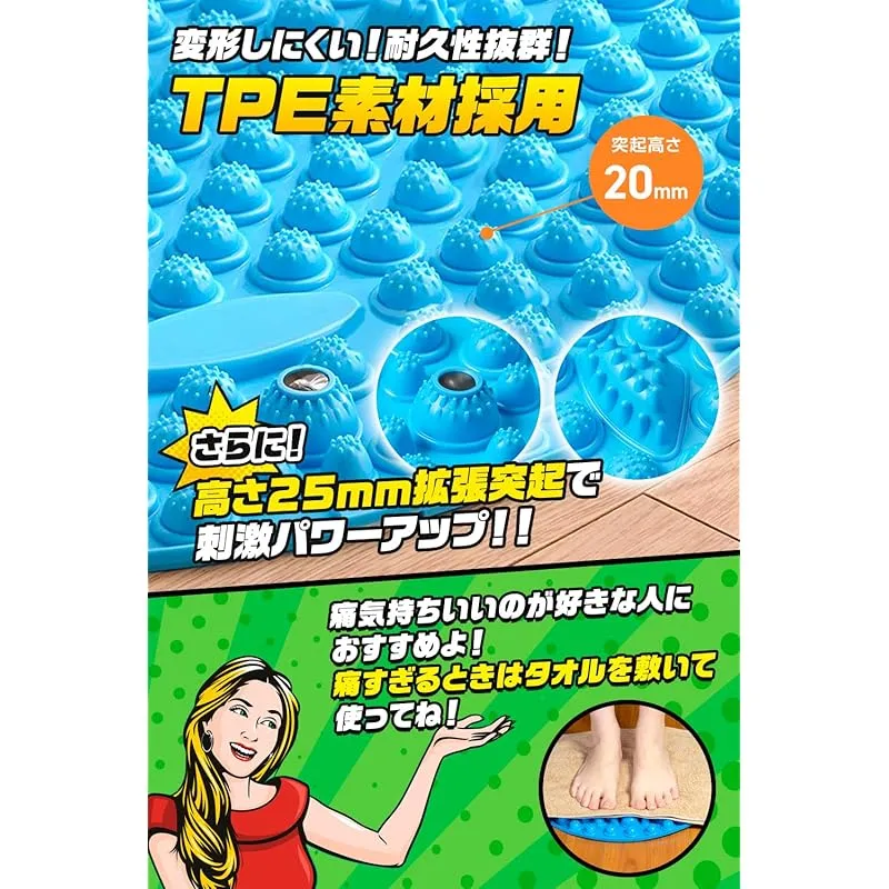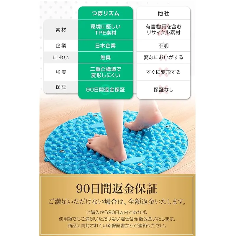 【 ボディケアのプロも注目!本格派の足ツボマット 】 「つぼリズム」は ボディケアのプロも注目する指圧ボード です。一般的な足ツボマットと違い、 足裏の様々なポイントに心地よい刺激を与えるよう設計しました。表面の突起は、まるで手のひらで押されているような心地よさを提供し、足裏全体をバランスよく刺激します。さらに、 耐久性の高い素材を使用 しており、長時間使用しても変形しにくい設計です。 日本企画の高品質な足ツボパッド だからこそ、安心して長く使えます。