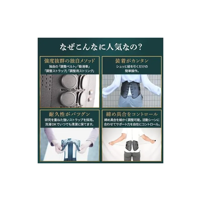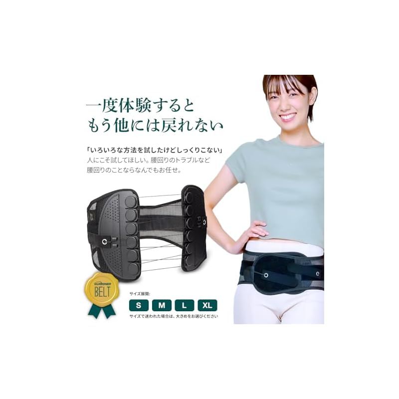 【商品概要】 独自開発の軽くヒモを引くだけで簡単に装着できる「 腰サポーター 」「 コルセット 」 独自の調整ストラップと10個の動滑車が、強力な固定力を発揮し、腰をしっかりサポート 巻く位置を変える事で、「 腰サポーター 」「 骨盤ケア 」「 腹圧ベルト 」1枚3役 食事の前後、立ったり座ったり、幅広いシーンに合わせて締め具合を自在に調整可能 軽くて通気性に優れている上に、ネットに入れて洗濯できるいつでも清潔にお使いいただけます