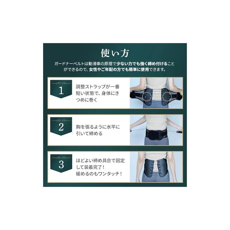 【商品説明】 ガードナーベルトは巻く位置を変える事で、「 腰サポーター 」「 骨盤ケア 」「 腹圧ベルト 」1枚3役。腰の負担の軽減、骨盤全体のケア、姿勢のサポートを行います。 腰に巻けば、骨盤を正しい位置に固定して美しい姿勢を保ち、腰の負担が減り、長時間のデスクワークで腰に負担がかかる方や仕事中の不自然な体勢がつらい方におススメです。骨盤や腰骨の一番出ている位置に巻くことで、骨盤をグッと引き締め骨盤全体をケアするので、出産後の方にもおススメです。骨盤よりも高い位置のお腹周りに巻くことで、腹圧を上げて体幹を安定させるため、アスリートやウエイトトレーニングをする本格派の方にもおススメです。 ガードナーベルトは伸縮性が少なくしっかりと固定できる調整ベルトを採用。動滑車10個で引っ張る力を倍増し、調整ストラップで簡単に装着が可能。強いストリングと耐久性のある素材を使っているため、ネットに入れて洗濯する事ができて清潔に保てます。 サイズはS、M、L、XLサイズをご用意。サイズに迷ったときは、大きめサイズを選ぶのがおすすめです。 これひとつで「 腰サポーター 」「 骨盤ケア 」「 腹圧ベルト 」の3役をこなす経済的なオールラウンダーとして、日々の健康と快適な生活を支えます。