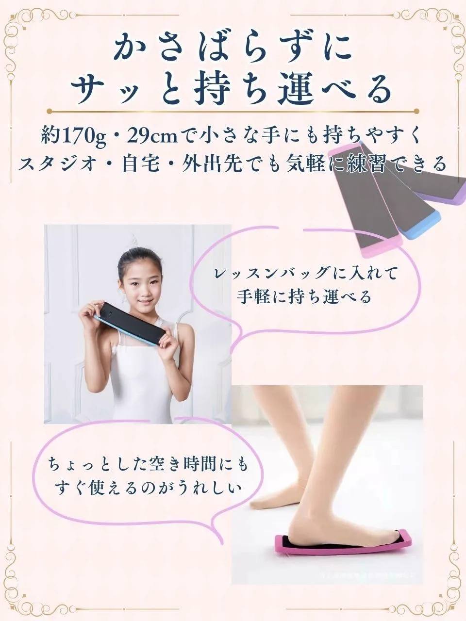 【屋内外問わず使用・持ち運びにも便利】軽量かつコンパクトな設計のため持ち運びしやすく、自宅、ダンス教室、練習スタジオなど、様々な場所でのトレーニングに対応します。バッグにすっきり収まるサイズ感なので、レッスンの合間や自宅での自主練習にも気軽に取り入れられます。身体の感覚を忘れないうちにいつでもターン練習が可能です。