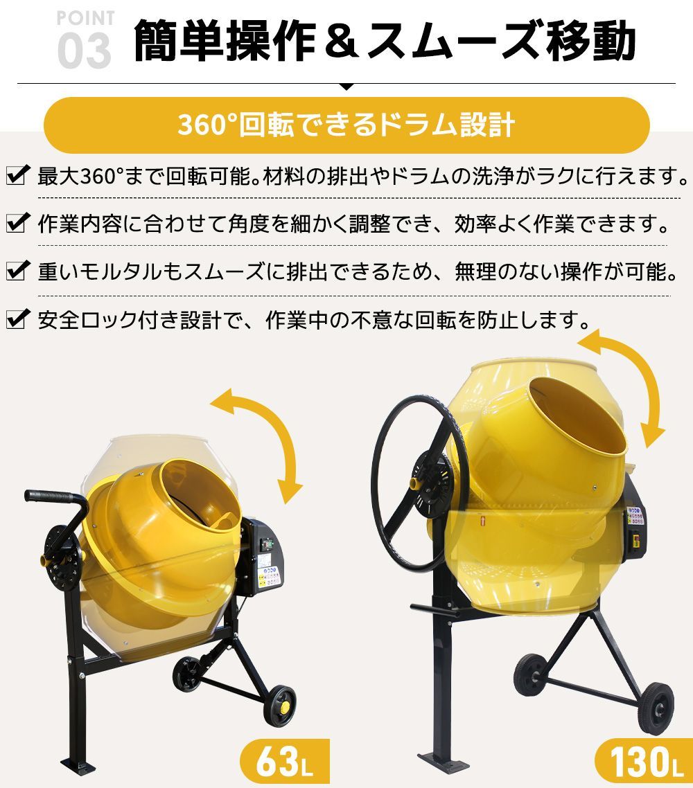 【簡単操作&スムーズ移動】360°回転できるドラム設計✔ 最大360°まで回転可能。材料の排出やドラムの洗浄がラクに行えます。✔ 作業内容に合わせて角度を細かく調整でき、効率よく作業できます。✔ 重いモルタルもスムーズに排出できるため、無理のない操作が可能。✔ 安全ロック付き設計で、作業中の不意な回転を防止します。