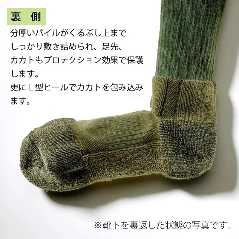 【商品概要】 サイズはSサイズ(23-25)、Mサイズ(25-27)、Lサイズ(27-29)、カラーはOD(オリーブドラブ)、ブラックよりお選びください。 ガッツマンとは自衛隊員さんの「行軍に耐えれる靴下を」とのお声から誕生したソックスブランドで、現在も実際に自衛隊員さんにご利用いただいております。 足裏形状を科学した特殊パイルソックスです。 内側の分厚いパイルと可動部のメッシュが頑丈さと通気性の両方を叶えました。 足首からふくらはぎ部分はゴムを段階的に緩めた構造の”テーパー形状”にて最適着圧を実現しました。 当商品は自衛隊員さんの40キロ行軍実績ソックスとしてご利用いただいております。半長靴をはじめ、安全靴・登山靴も快適にご利用いただけます。 日本製