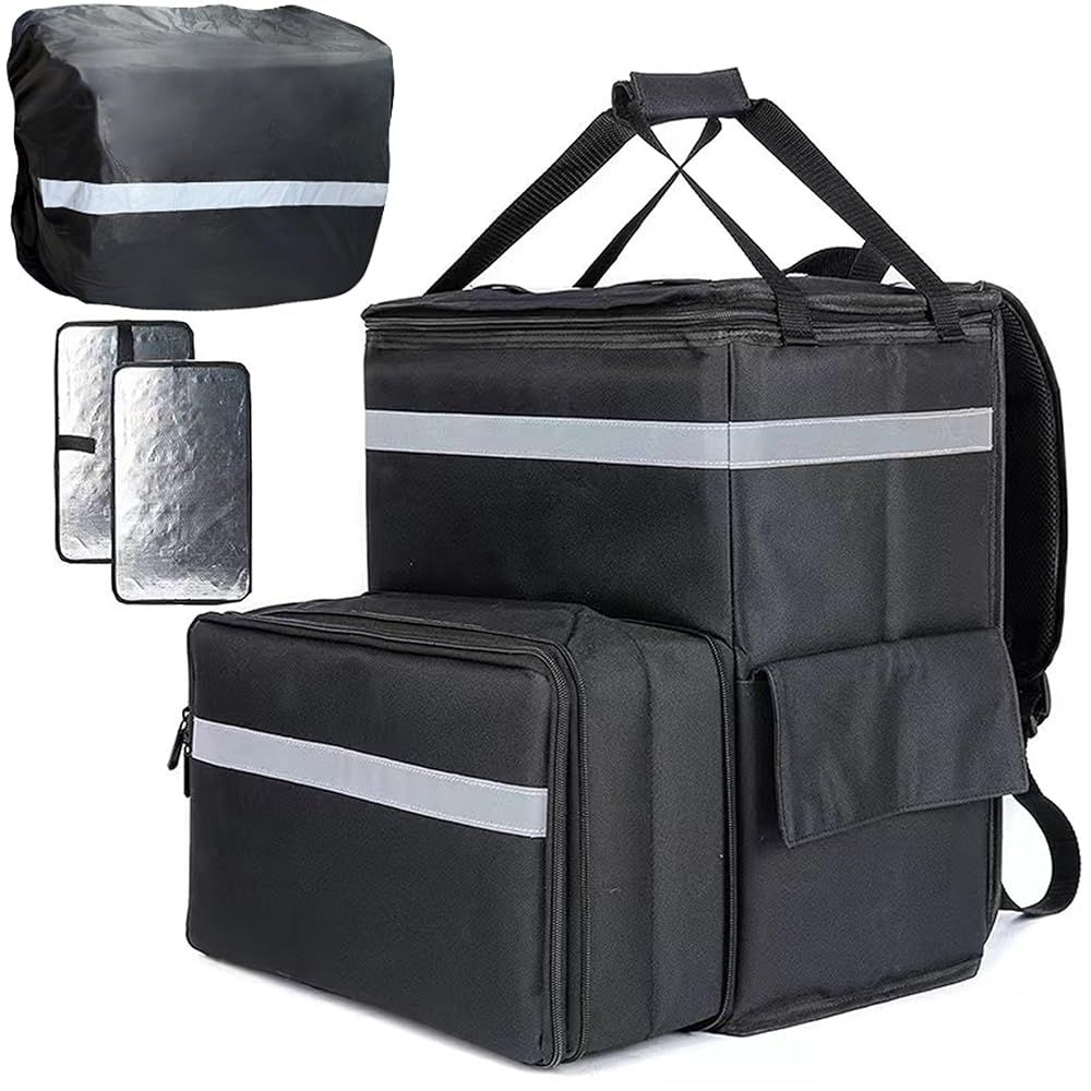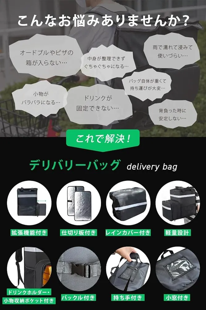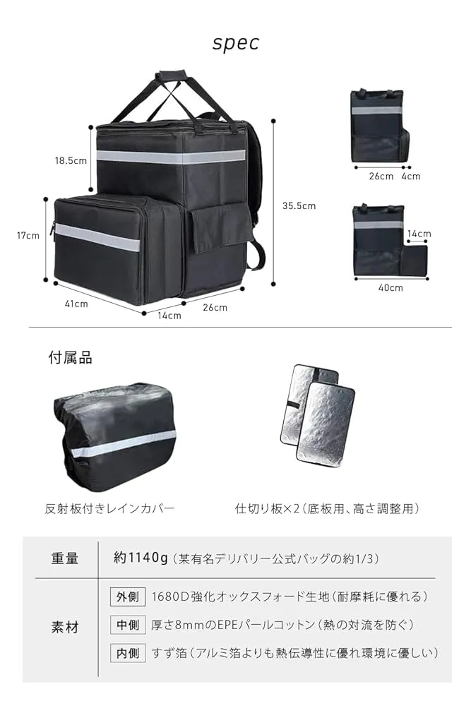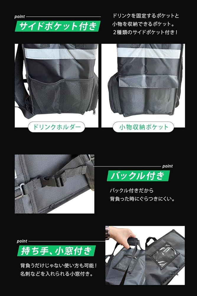 50Lの大容量を誇るデリバリーバッグは、フードデリバリーやイベント出店、キャンプやアウトドアにも最適な多機能バッグです。内部には厚さ8mmのEPEパールコットンと高性能断熱材を使用し、食材や飲み物を長時間温かく、または冷たく保つことができます。防水加工された1680D強化オックスフォード生地を採用しており、雨や雪の日でも安心。さらに、レインカバーが付属しているため、大雨時でも荷物をしっかり保護します。 拡張機能付きで、ピザやオードブルの大きな箱も楽々収納可能。仕切り板を使えば、ドリンクや小物を整理して固定でき、配達時の荷崩れを防ぎます。サイドにはドリンクホルダーや小物ポケットを装備し、利便性も抜群。軽量設計で重さは約1.1kgと、他社製品の約1/3の軽さを実現しました。 背負うだけでなく、持ち手付きで手持ち使用も可能。背面には安定感を高めるバックルや、小窓も備わっており、実用性と使いやすさを兼ね備えています。フードデリバリー、Uber Eats、出前館などの配達員の方はもちろん、アウトドアや買い物バッグとしても活躍します。 「主な仕様」