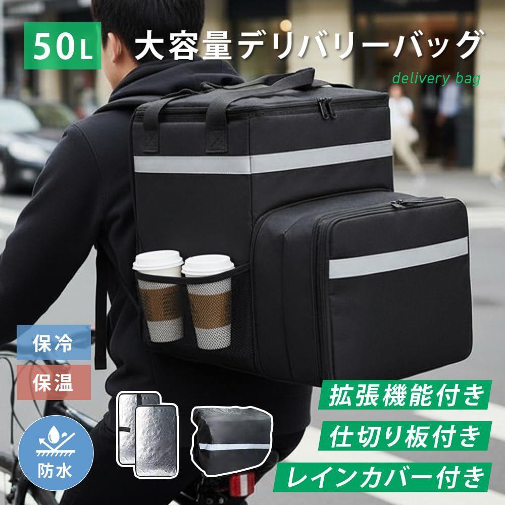 デリバリーバッグ 大容量 軽量 配達バッグ 拡張機能付き レインカバー付き 保温 保冷 防水 折りたたみ式 50L