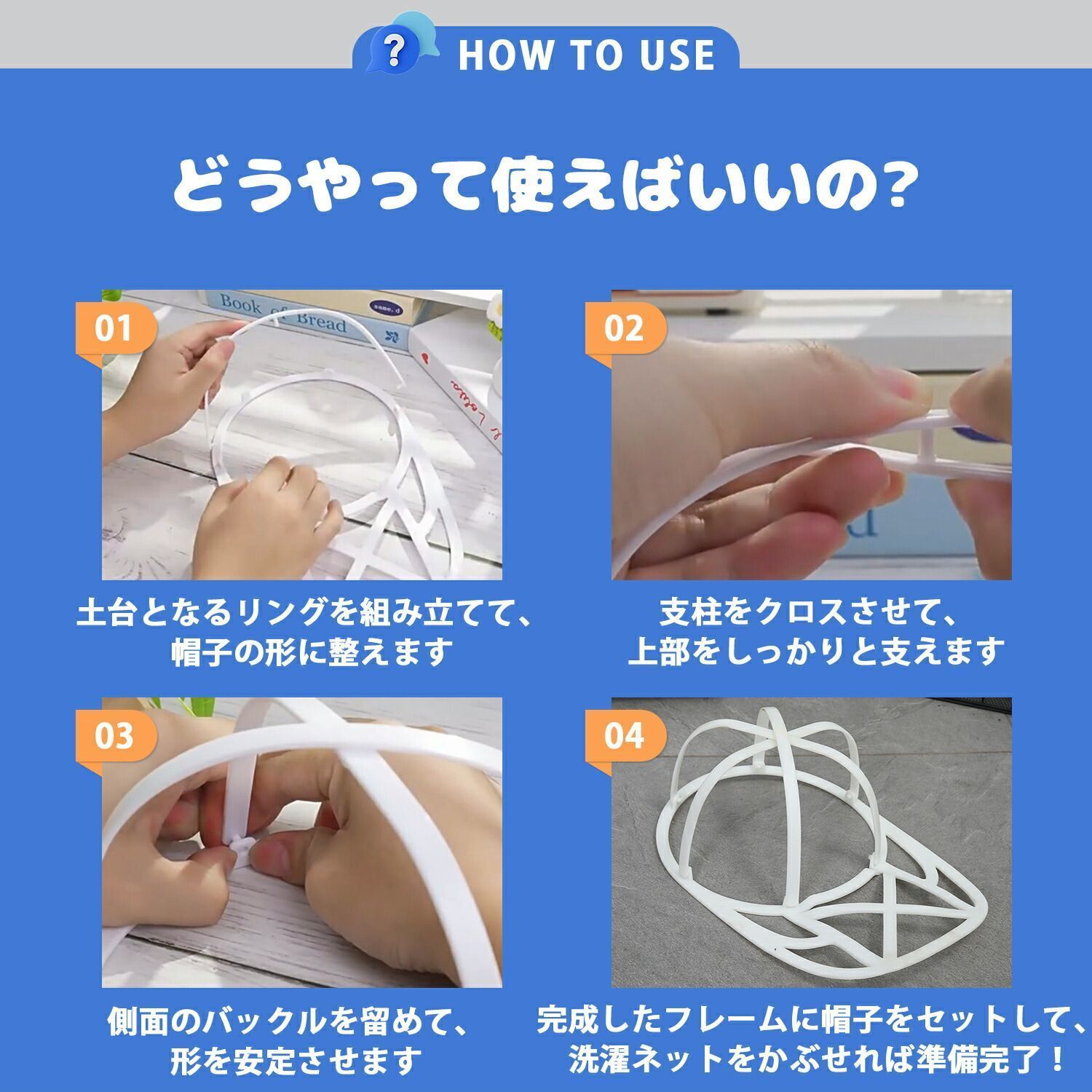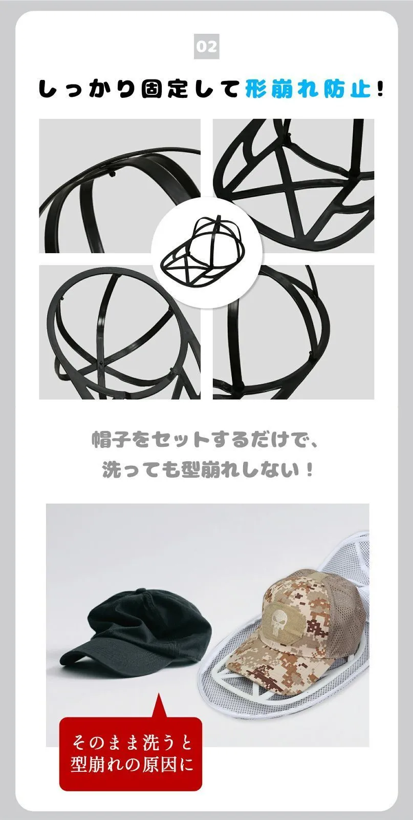 【帽子洗濯ホルダー】キャップ専用洗濯グッズ お気に入りの帽子を守りながら清潔に! 洗濯機で簡単に洗える、型崩れ防止・洗濯ネット付きの便利アイテムです。 商品の特徴 型崩れ防止 しっかりフレームで帽子の形をキープ 洗濯ネット付き 摩擦や毛玉から保護し、傷みを軽減 ドラム式対応 洗濯機・乾燥機OK、簡単に洗えて安心 軽量で耐久性抜群 PVC素材で軽くて壊れにくい 対応帽子 キャップ・サンバイザー・キッズ帽にもぴったり 使い方(3ステップ) Step 1 支えフレームを組み立て、帽子をセット Step 2 ネットをかぶせ、洗濯機に入れるだけ Step 3 洗濯後はそのまま乾燥機でもOK 商品仕様 セット内容 支えフレーム ×1、洗濯ネット ×1 サイズ フレーム 約30×18×10cm/ネット 約32×20×12cm 素材 PVCプラスチック、ポリエステル繊維