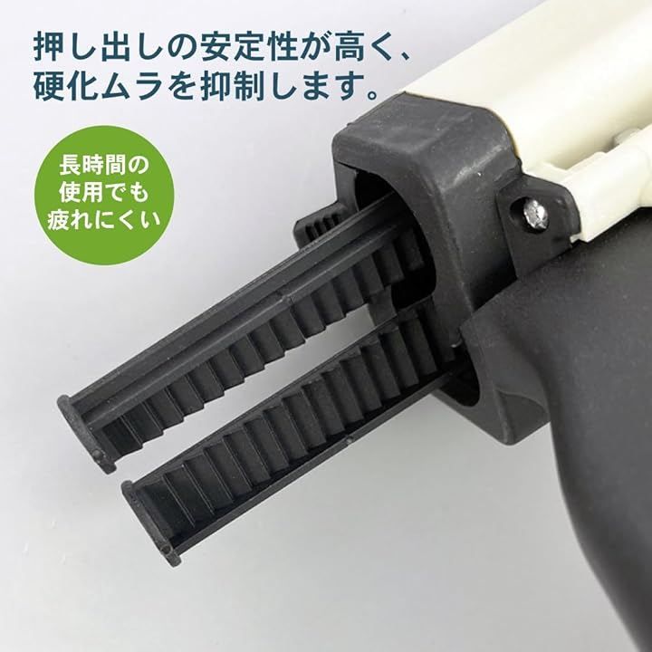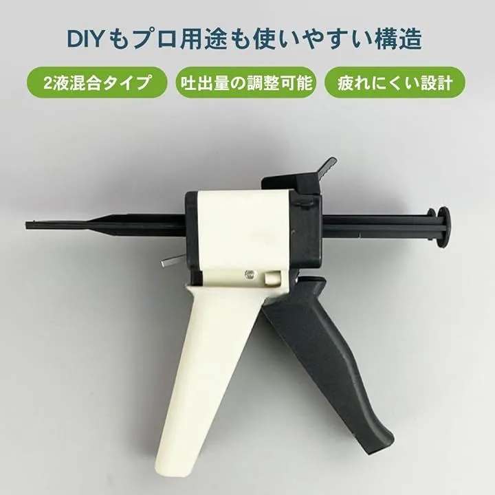 このアプリケーターガンは、2液混合タイプの接着剤専用として設計され、作業時の混合比や吐出量の調整がしやすい設計。