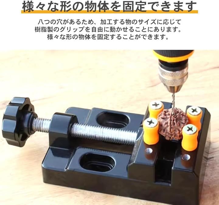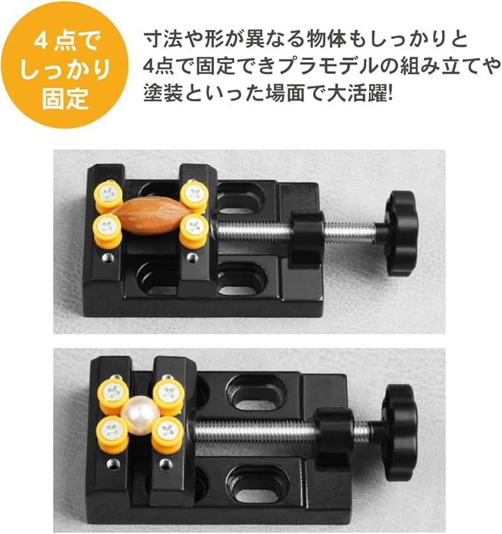 「4点でしっかり固定」寸法や形が異なる物体もしっかりと4点で固定することが可能であり、特に宝石やアクセサリーの穴あけ加工、プラモデルの組み立てや塗装といった細部にわたる作業で大活躍します。