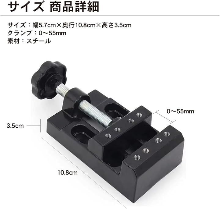 「商品詳細」サイズ:幅5.7cmx奥行10.8cmx高さ3.5cm クランプ:0~55mm 色:ブラック 素材:スチール