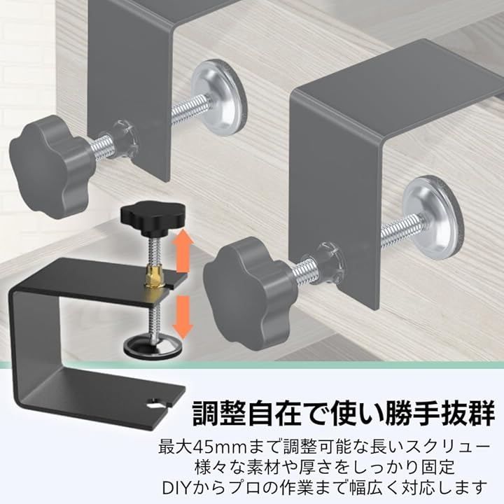 「強力固定と幅広い用途に対応」このC型クランプ4個セットは、最大45mmまでの調整が可能な長いスクリューを備え、木材やデスク、キャビネットなど、様々な素材や厚さを固定します。