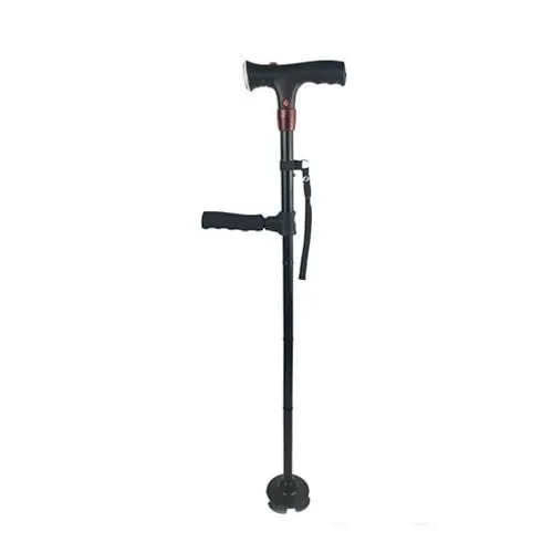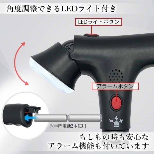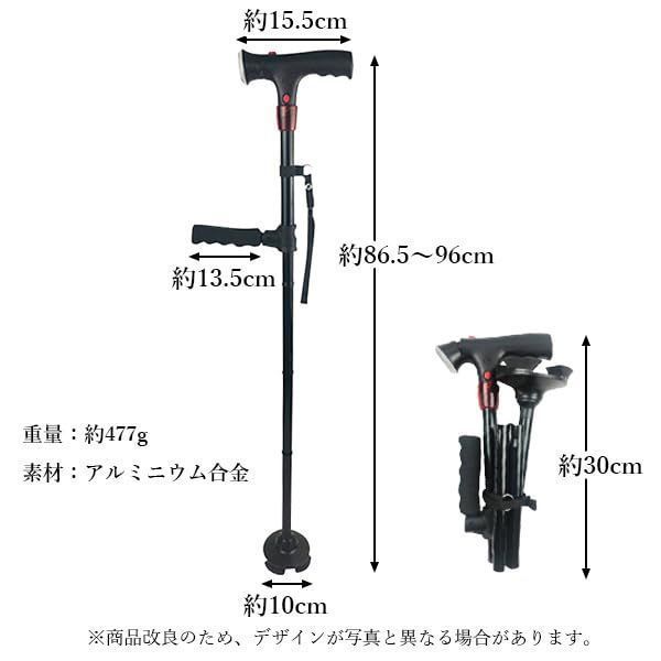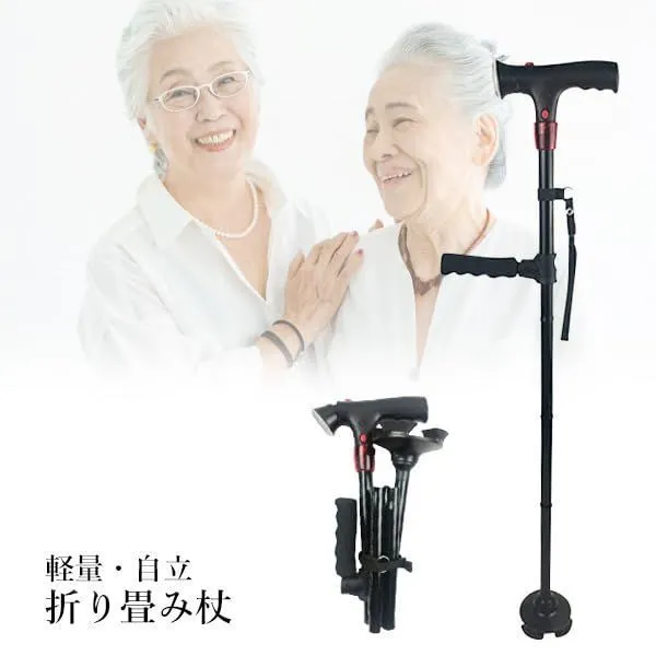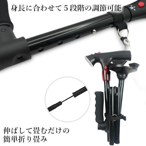 【商品説明】 ・自立式で折りたたむことができる杖です。 ・5段階の長さ調節付きで自分に合った長さに調節することができます。 ・4点で支える自立式なのでスマホを触るときなどに手を放しても倒れません。 ・立つときと座るときに使える補助ハンドル付きです。 ・LEDライト付きで足元を照らしたり、鍵穴を照らすのに役立ちます。