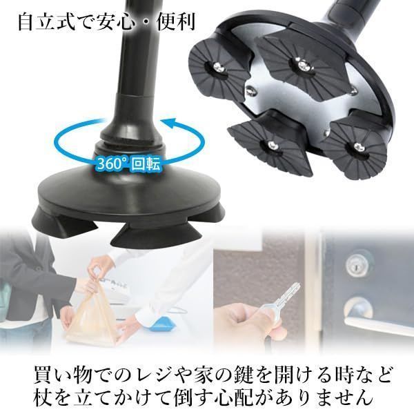 【ジョイリビング】をご覧いただきありがとうございます。 送料は全国一律無料です。 以下商品説明となります。 ------------------------------------ 折りたたみ杖 杖 軽量 つえ 自立式 4点杖 介護 ステッキ LEDライト 歩行器 長さ調節可能 5段階調節 360度回転 自立式で折りたたむことができる杖です。 5段階の長さ調節付きで自分に合った長さに調節することができます。 4点で支える自立式なのでスマホを触るときなどに手を放しても倒れません。 立つときと座るときに使える補助ハンドル付きです。 LEDライト付きで足元を照らしたり、鍵穴を照らすのに役立ちます。