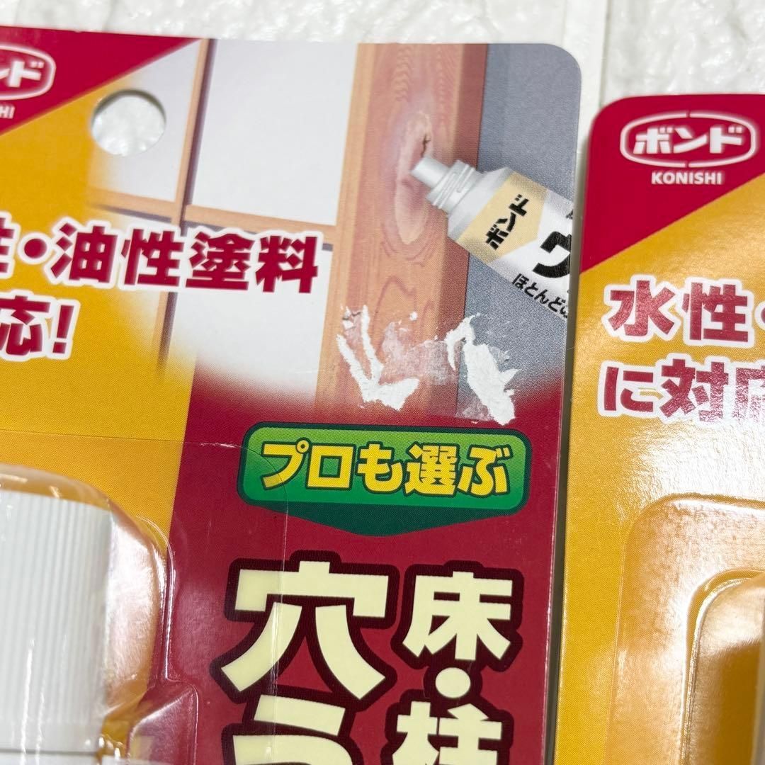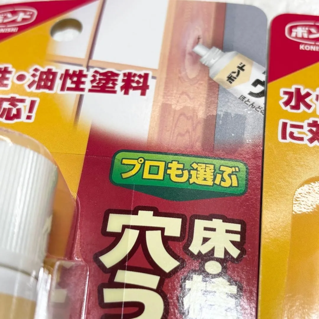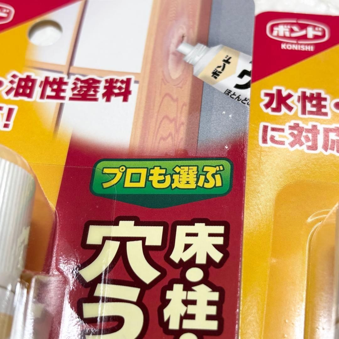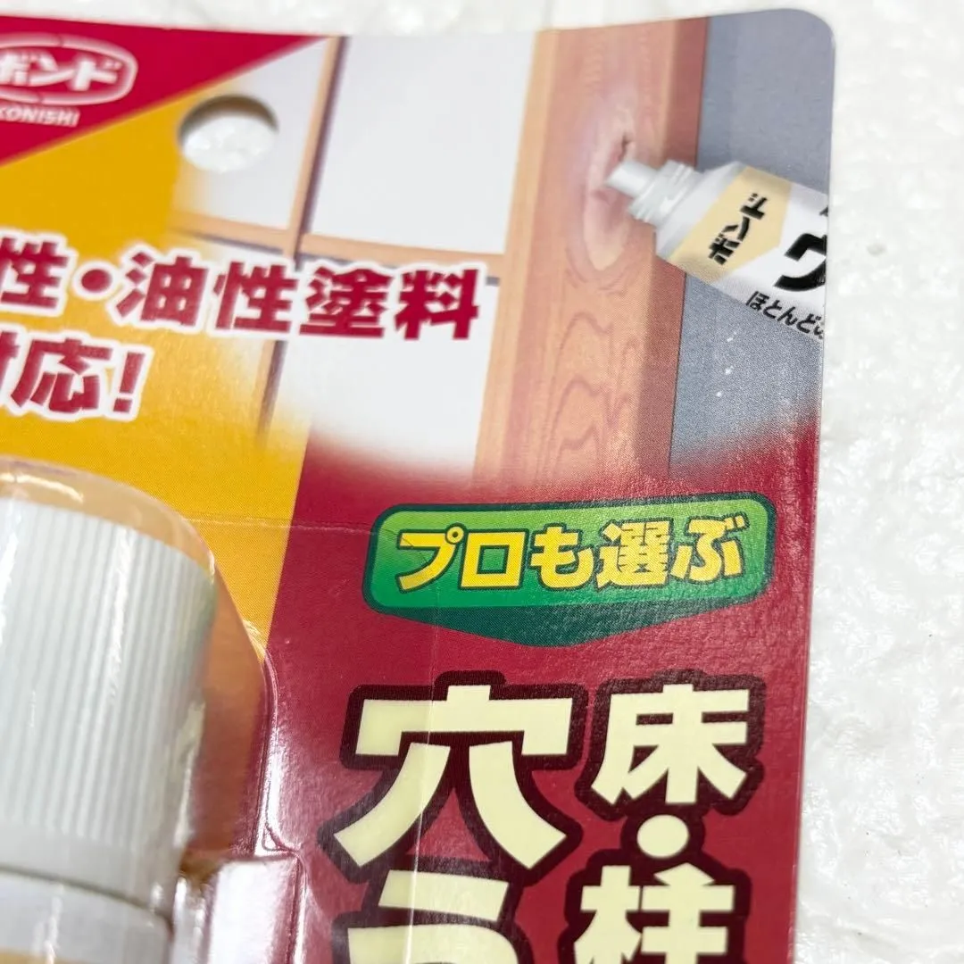 【用途】 ・床・柱・家具の穴うめに ・フローリング床・幅木・階段のひび割れ、キズに ・木製家具や建具の割れ目・あてキズに ・木製ドアや窓枠の割れ目・あてキズに ・釘・ネジを抜いたあとの穴うめに ※本品は小さな箇所の充てんにお使いください。幅または深さが5mm以上の箇所に使用すると、乾燥後にひび割れ・凹みが目立ちます。 ※浴室内木部などの常に水がかかる用途や、金属に接触する所には適しません。