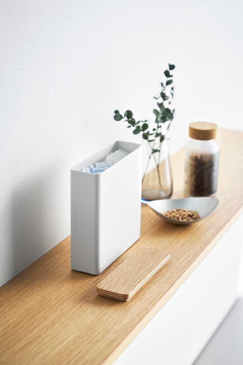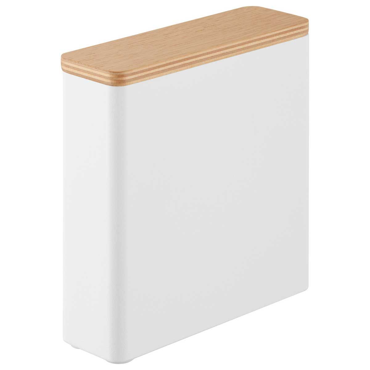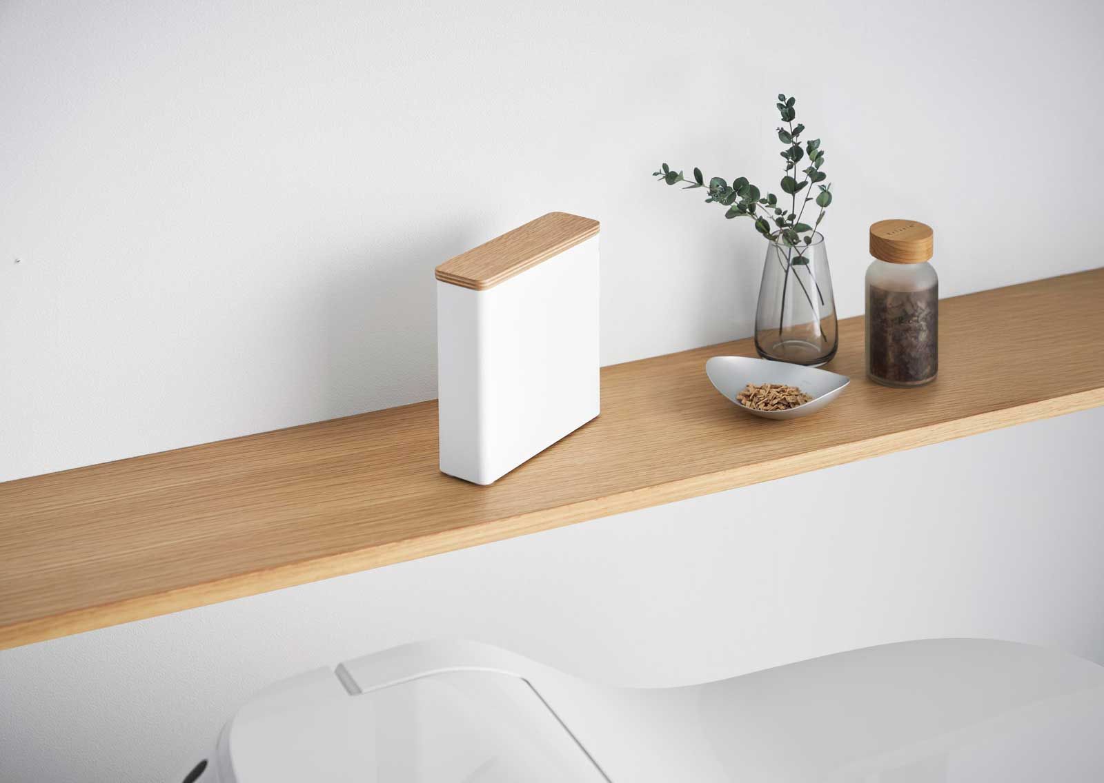 追加吸収ライナーやタンポンなどのスリムタイプのサニタリー用品にピッタリな収納ケースです。限られたトイレ空間でも場所を取らず手の届く場所に置いておけば、必要なときにすぐ取り出せて便利です。種類ごとに分けて整理できる仕切り付き、木目の美しいデザインがシンプルなトイレ空間に温かみをプラスします。
