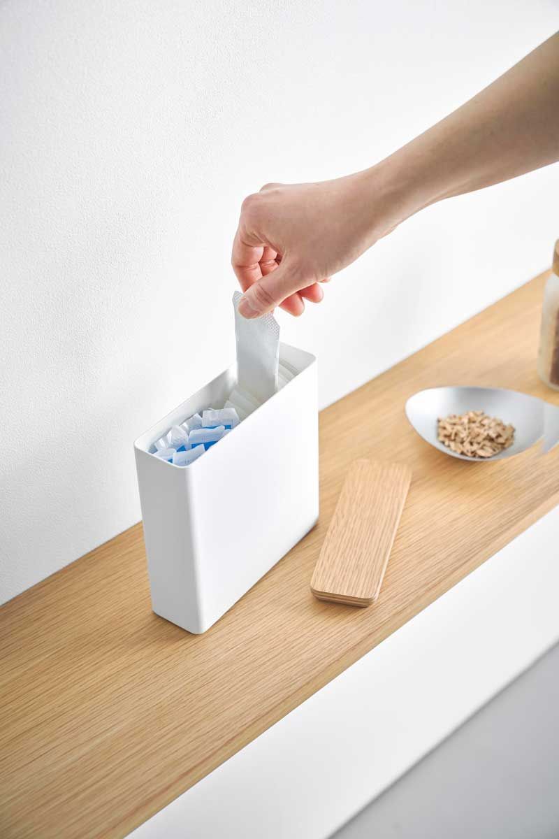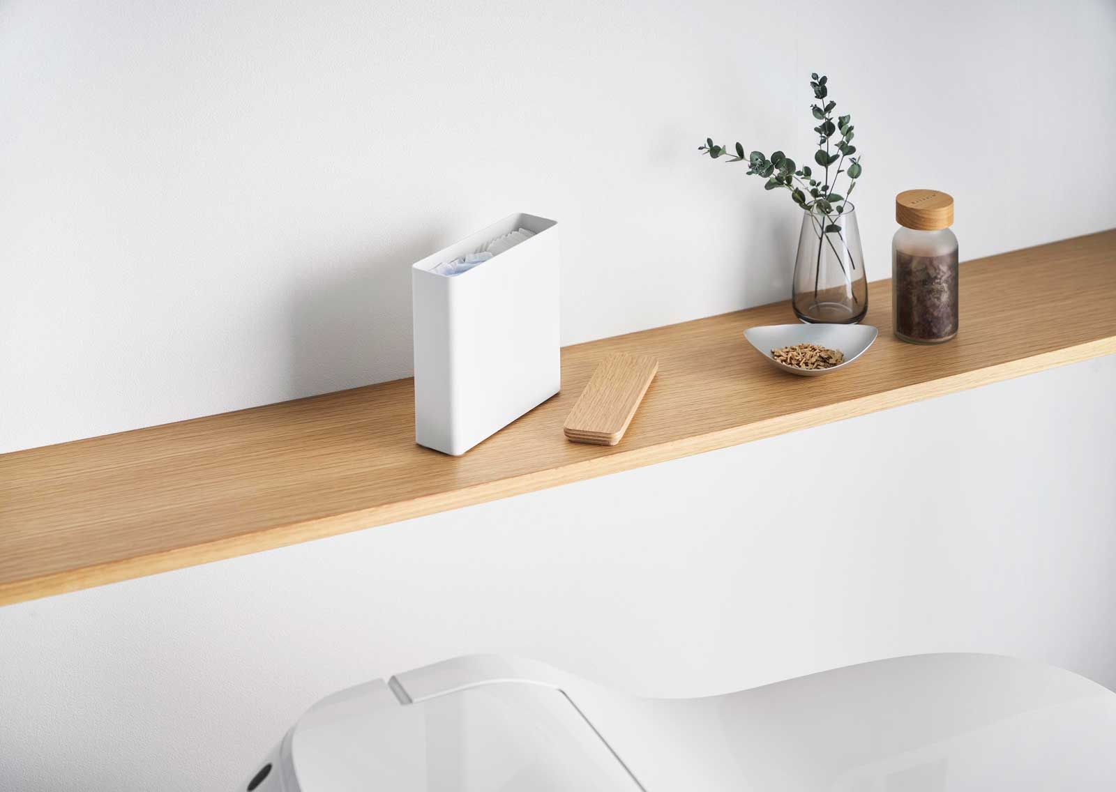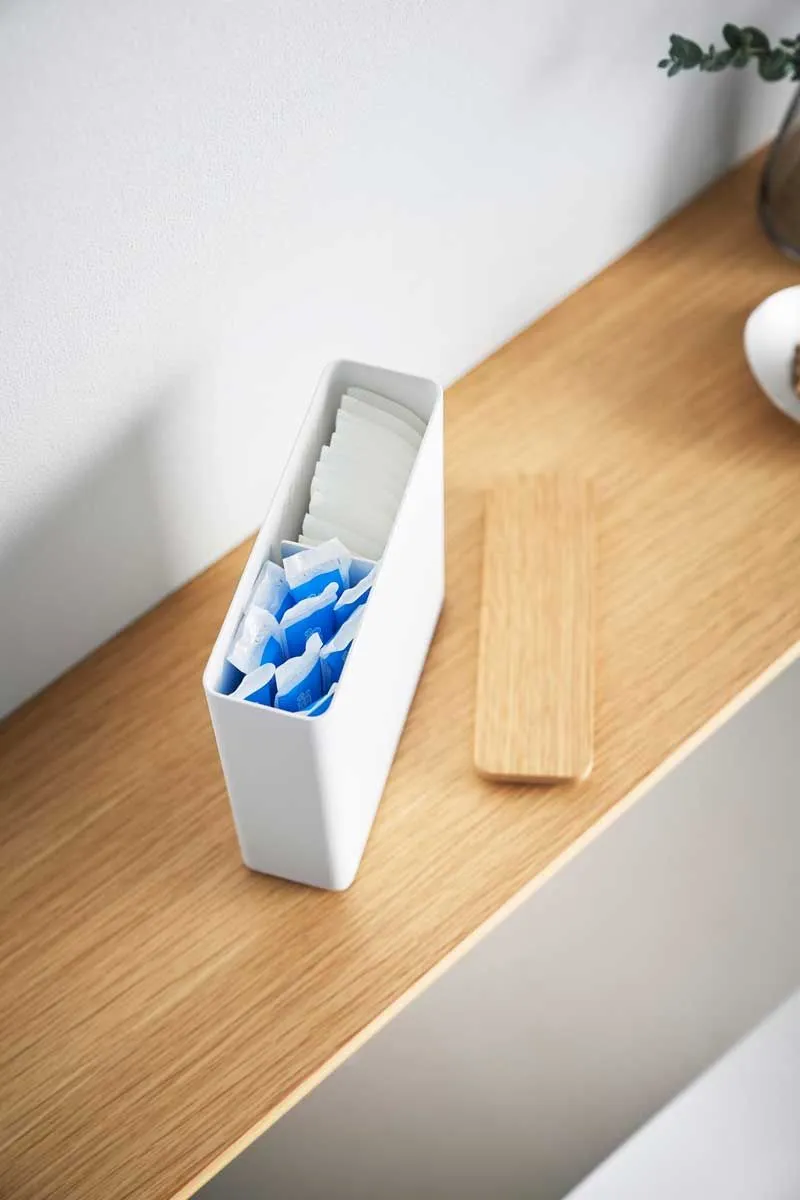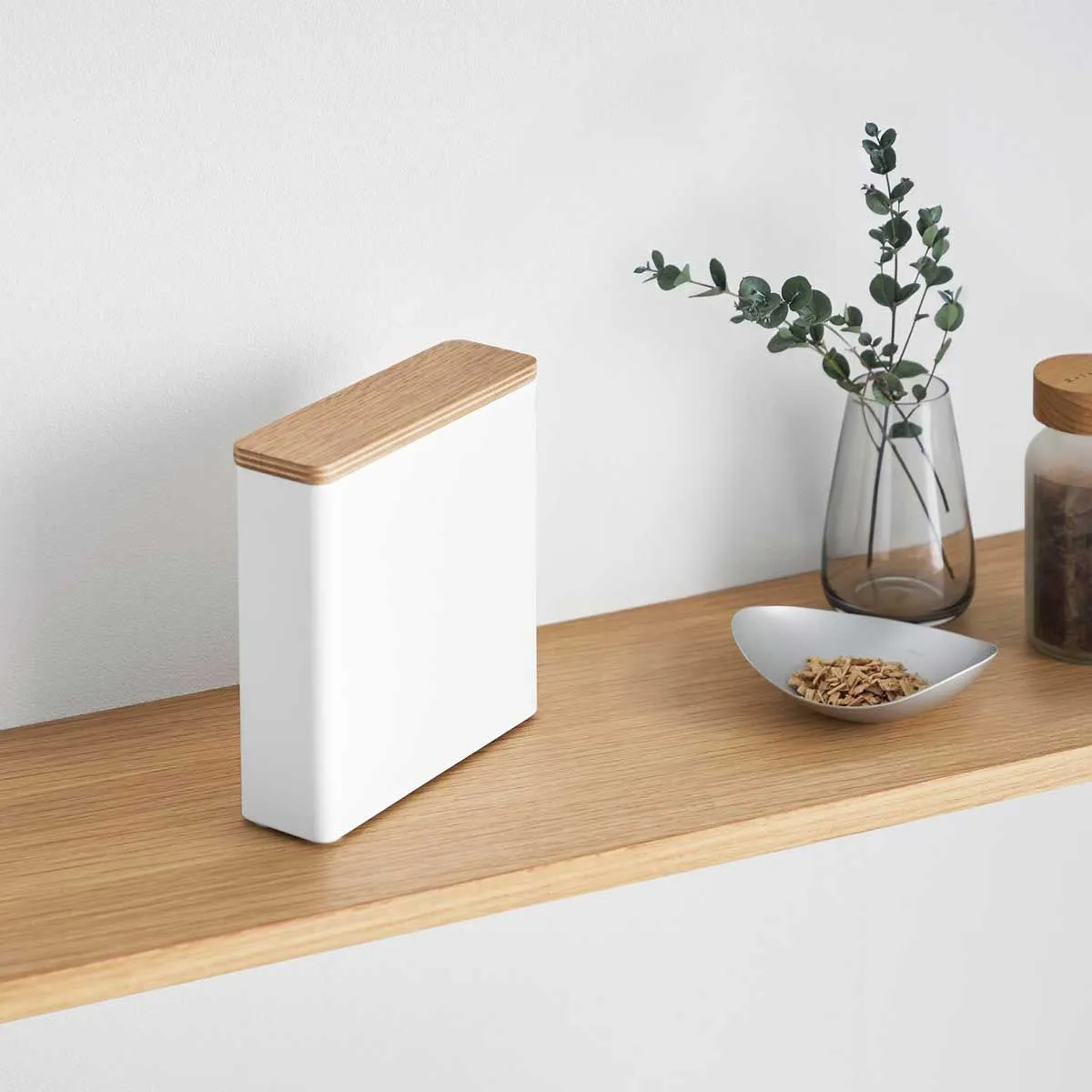 追加吸収ライナーやタンポンなどのスリムタイプのサニタリー用品にピッタリな収納ケースです。限られたトイレ空間でも場所を取らず手の届く場所に置いておけば、必要なときにすぐ取り出せて便利です。種類ごとに分けて整理できる仕切り付き、木目の美しいデザインがシンプルなトイレ空間に温かみをプラスします。