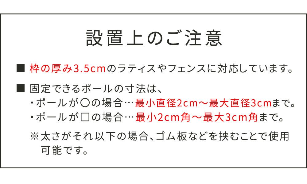 ●ラティス・フェンス 壁面用固定金具(リング型/2個セット) 「下部用の購入ページです」 ベランダなどの格子フェンスに、ラティスやフェンスを固定したい時に。 ※上部用は別売りです。 ※枠の厚み3.5cmのラティスやフェンスに対応しています。 ※固定できるポールの寸法は、 ・ポールが〇の場合…最小直径2cm?最大直径3cmまで。 ・ポールが□の場合…最小2cm角?最大3cm角まで。 太さがそれ以下の場合、ゴム板などを挟むことで使用可能です。 ※お庭やベランダ、店舗、公園等に、ラティスやフェンスを自作できる金具シリーズです。空間を仕切るだけでなく、日よけや、ディスプレイのベースとしても活用でき、DIY初心者さんでも簡単設置が可能。まるで作り付けのようなフェンスが設置でき、見映えのするエクステリアに。自宅に癒しの空間を。