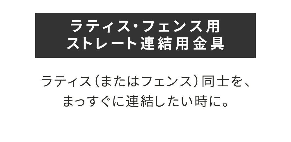 ●ラティス・フェンス用 ストレート連結用金具(8個セット) ラティス(またはフェンス)同士を、まっすぐに連結したい時に。 ※枠の厚み3.5cmのラティスやフェンスに対応しています。 ※お庭やベランダ、店舗、公園等に、ラティスやフェンスを自作できる金具シリーズです。空間を仕切るだけでなく、日よけや、ディスプレイのベースとしても活用でき、DIY初心者さんでも簡単設置が可能。まるで作り付けのようなフェンスが設置でき、見映えのするエクステリアに。自宅に癒しの空間を。