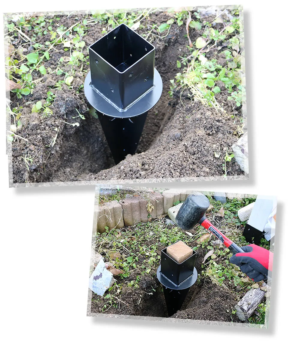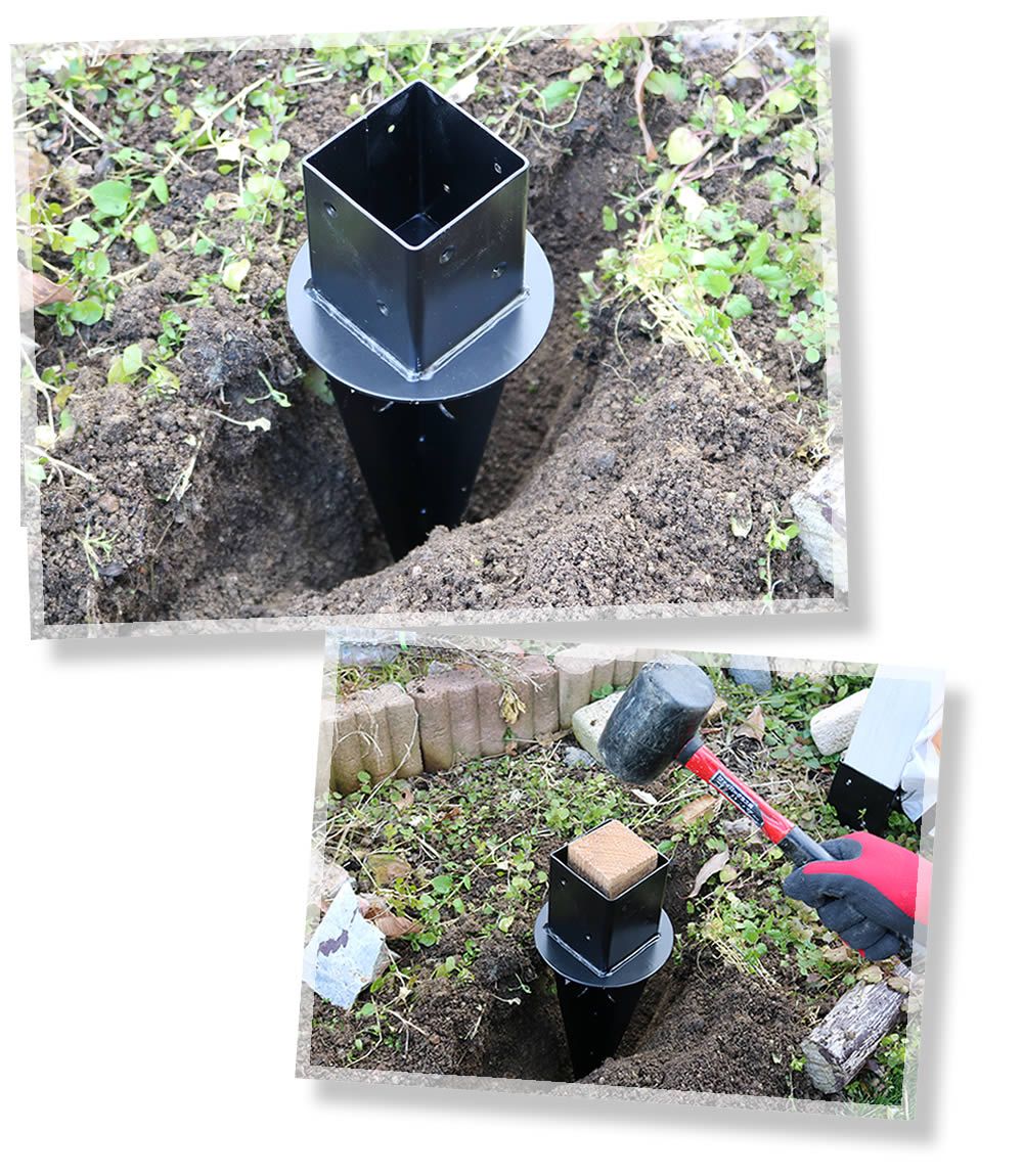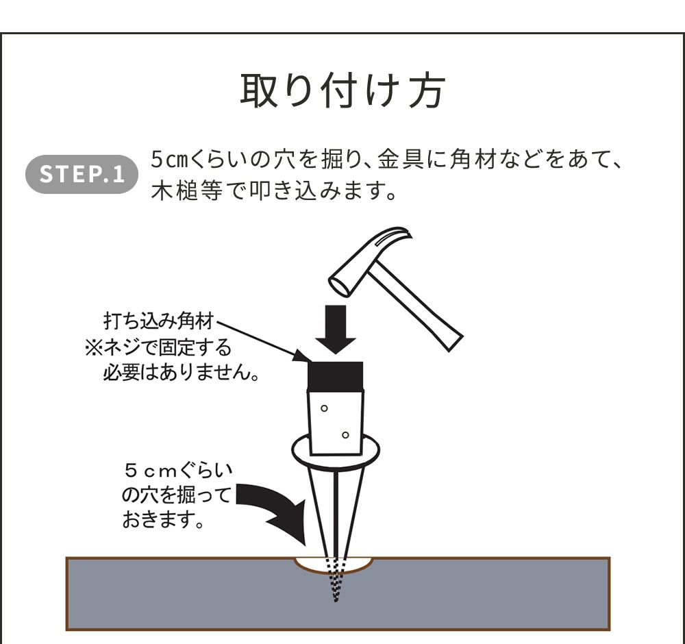 ●土中用支柱固定金具(6個セット) ラティスやフェンスを、「土の上」に設置したい時に。 ※金具の埋め込み部分が約35cmあります。設置位置の土中に障害物がないかご確認の上、設置してください。 ※地面が柔らかい場合、モルタルやコンクリートを併用するなど、補強をお願いいたします。 ※お庭やベランダ、店舗、公園等に、ラティスやフェンスを自作できる金具シリーズです。空間を仕切るだけでなく、日よけや、ディスプレイのベースとしても活用でき、DIY初心者さんでも簡単設置が可能。まるで作り付けのようなフェンスが設置でき、見映えのするエクステリアに。自宅に癒しの空間を。。