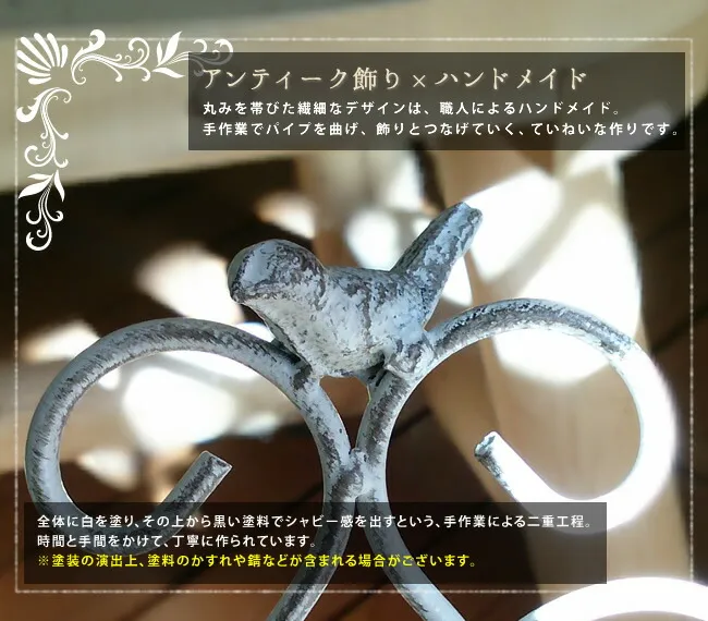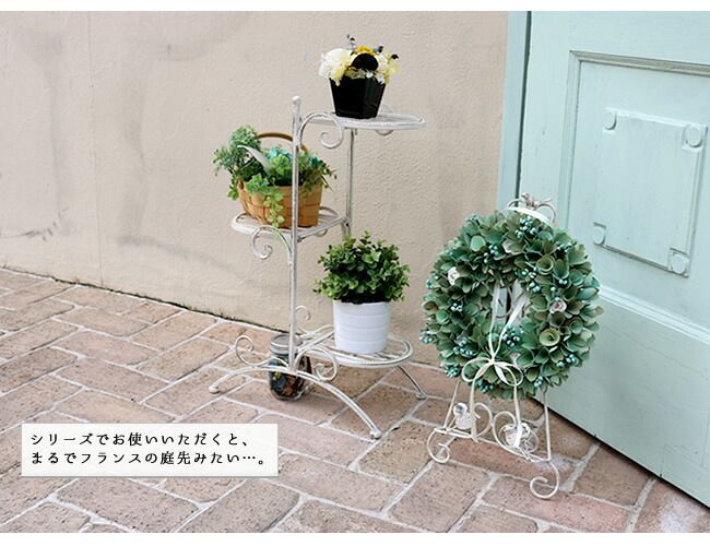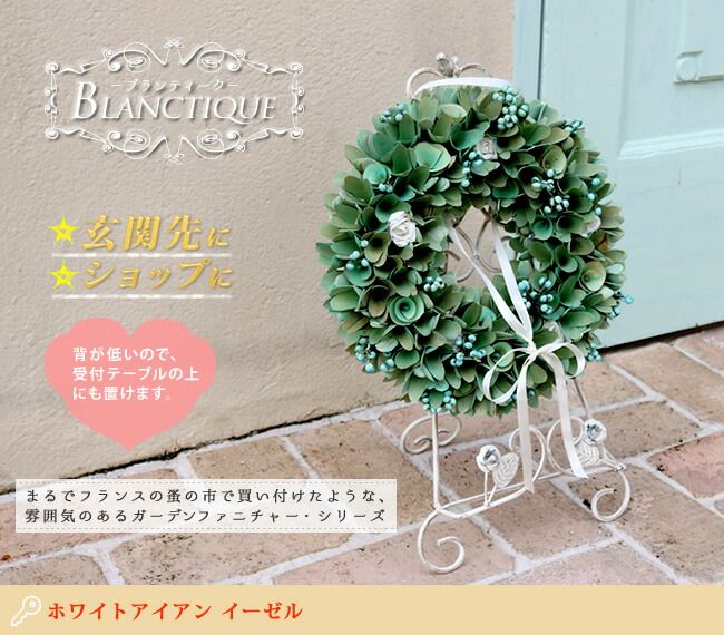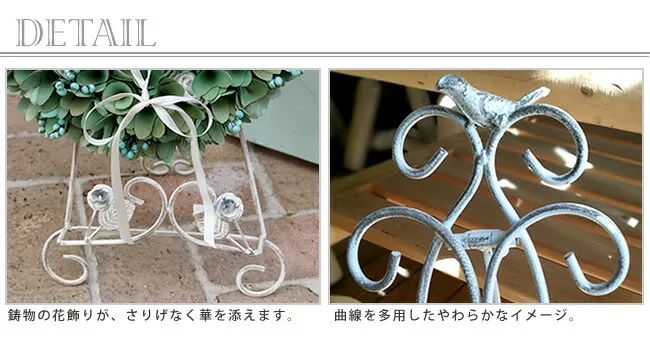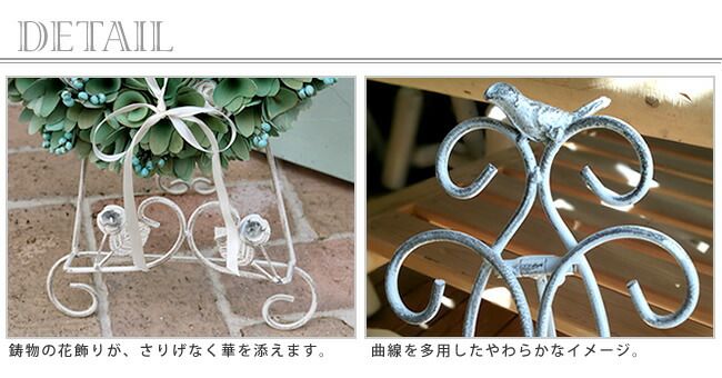 【ブランティーク ホワイトアイアン イーゼル】まるでフランスの蚤の市で買い付けたような、雰囲気のあるガーデンファニチャー・シリーズあたたかな気持ちにさせてくれるフレンチ・アンティークフランス語で「白」を意味する「ブラン」に、アンティークな魅力をプラスしたシリーズ、「ブランティーク」。なじみやすい清潔感のあるオフホワイトと、気品あるシャビー感が絶妙にミックスされ、お庭やベランダ、バルコニーの雰囲気を味わい深いものにしてくれます。シリーズで揃えられるので、統一感のあるガーデンコーナーが作れます。シャビーなインテリアに興味があるけれど、どこから手をつけていいかわからない・・・という方にも気軽に楽しんで頂けます。ひとつ置くだけで、まるでフランスの郊外のような雰囲気に時を忘れる・・・。そんなデザイン性の高い「ブランティーク」シリーズなら、オブジェを兼ねたガーデンアイテムとして長く愛されることでしょう。