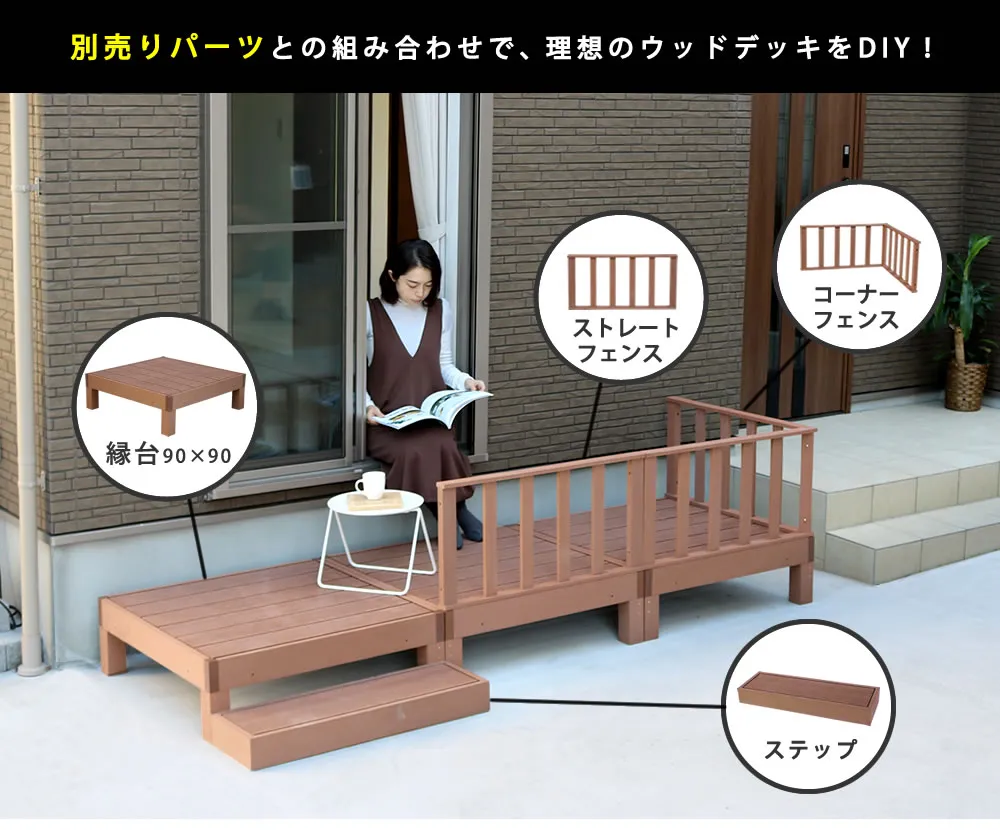 別売りの縁台やステップ、コーナーフェンスとの組み合わせで、デザイン性の高い、おしゃれなウッドデッキをお作りいただけます。