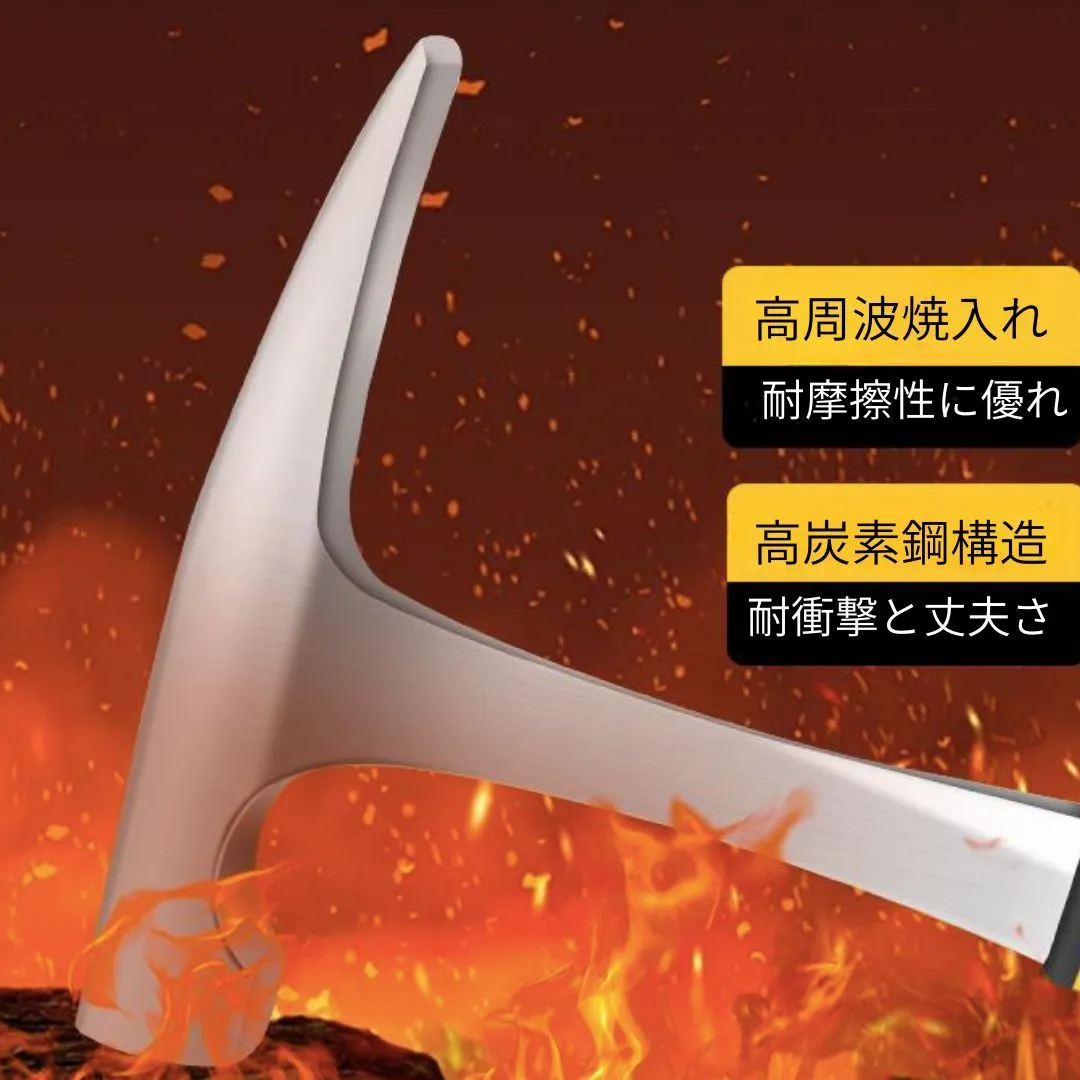 【高耐久・高硬度ヘッド】 高炭素鋼構造に加え、高周波焼入れ処理を施しているため、耐摩擦性と耐衝撃性に優れています。ハードな使用にも耐える頑丈な作りです。