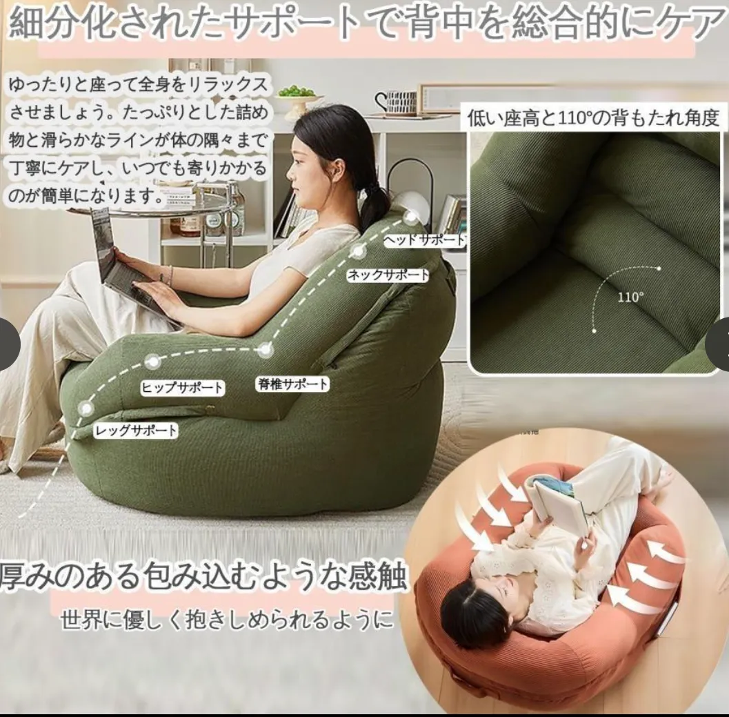 【優れた素材と機能】密度メモリーフォーム、大粒ビーズ使用したビーズソファーは、圧力にも強く、長時間使用してもくぼまない優れた品質を実現しています。座るたびに体をしっかりサポートし、シートとハイシートを合わせて110度背もたれの角度が、快適な座り心地を維持します。