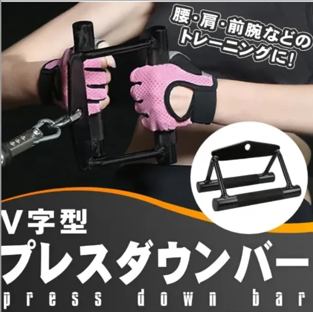両腕で掴んで左右均等にトレーニングできるV字型プレスダウンバーです。ジムや自宅にあるマシンに取り付けるだけでトレーニングできます。