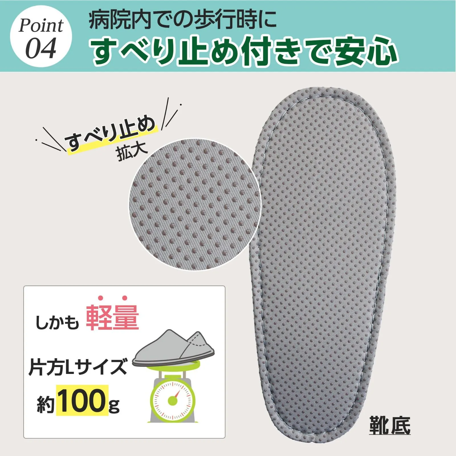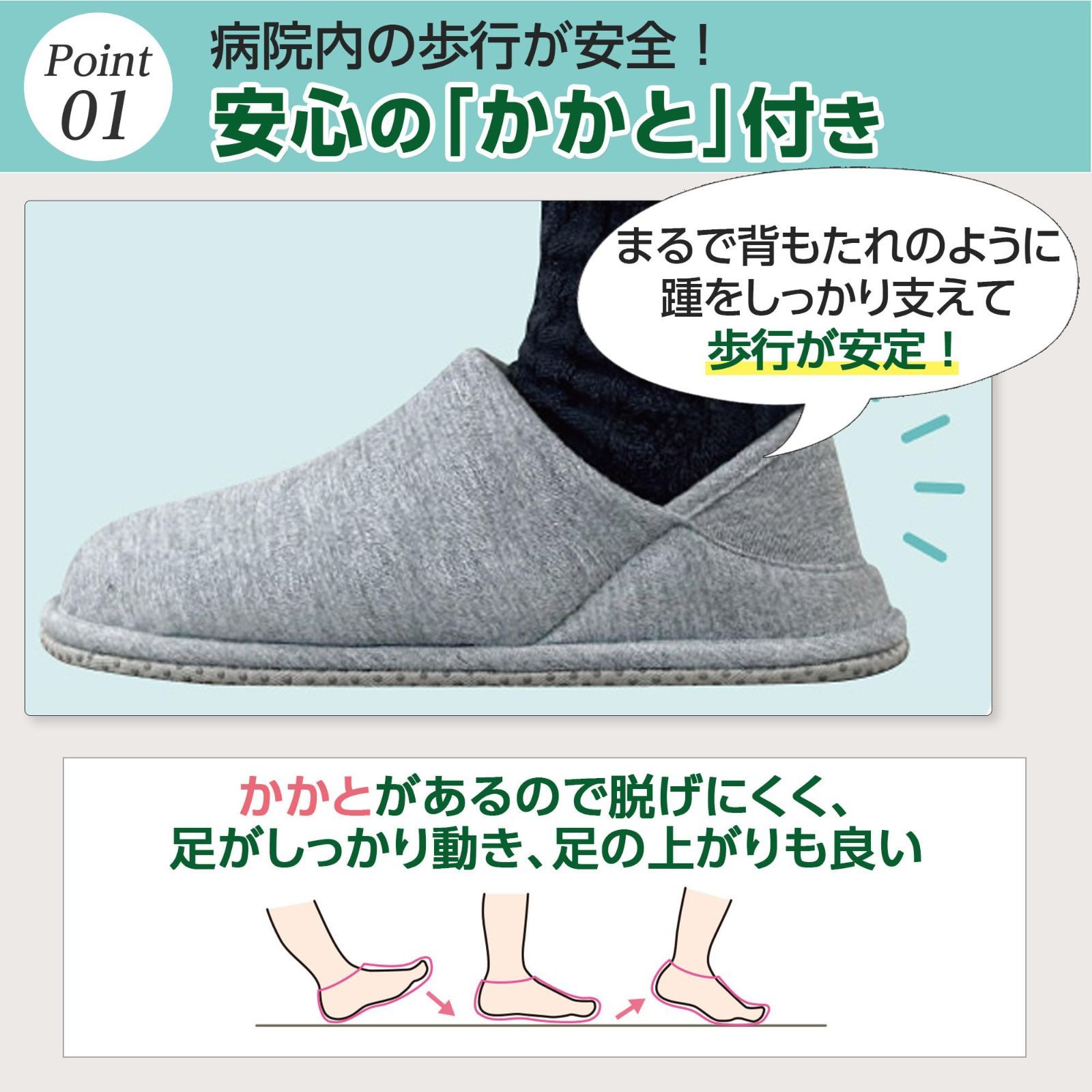 【病院・高齢者施設/入院・入居時の上履きとして】快適で安全な歩行をサポートするルームシューズです。入院・入居時の転倒予防として、スリッパの代わりとしてご活用いただけます。 靴底には滑り止めが付いており、かかとつきのスリッパのため歩行しやすく、病院や老人ホーム、デイサービスなど幅広い施設で使用されています。短期入院の方にもおすすめ。