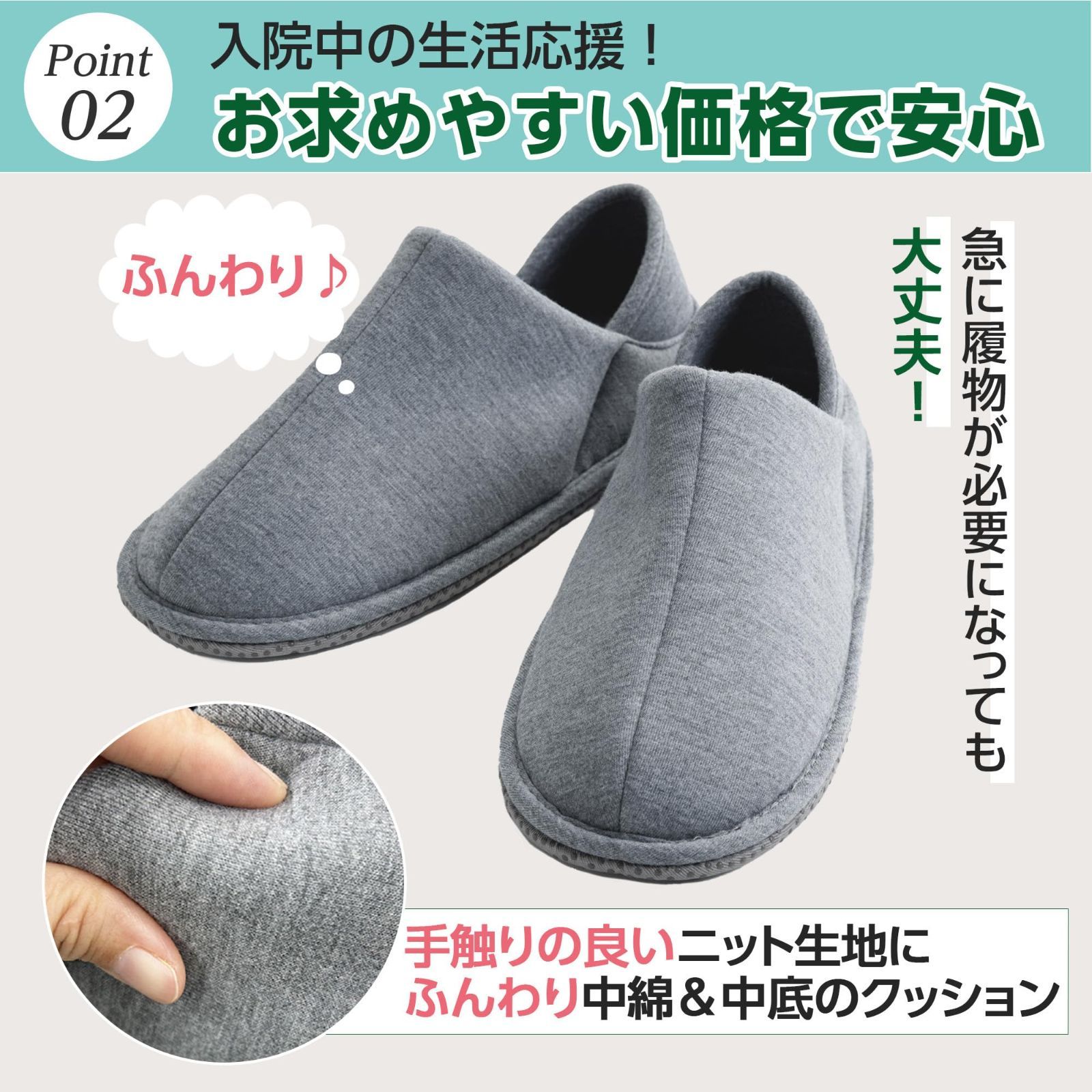【仕様・サイズ・カラー】<仕様>徳武産業/あゆみ シリーズ/かかとつきスリッパ/足囲3E相当/両足 <サイズ>3展開(S[21.0~22.5cm]、M[23.0~24.5cm]、L[25.0~26.5cm]) <カラー>グレー かかとが付いたスリッパで足元安心,短期入院の方にもおすすめ,左右同型のため履き間違えがありません,滑り止め付で安心な靴底,甲部分の立ち上がりで足入れしやすい 最後までご確認頂き誠にありがとうございました。 上記をご確認頂き、ご購入いただけましたら幸いです。 何かご不明な点がございましたらお気軽にメッセージからお問い合わせ下さい。