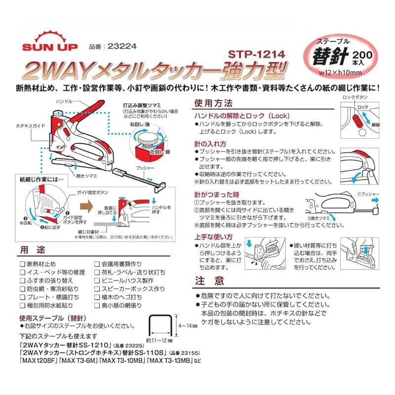 【迅速発送】SUN UP 2ウェイメタルタッカー強力型 & 替針(ステープル)200本付き STP-1214 断熱材止め 工作や設営作業等の小釘や画鋲の代わりに 木工策や書類などの紙の綴じ作業に 1