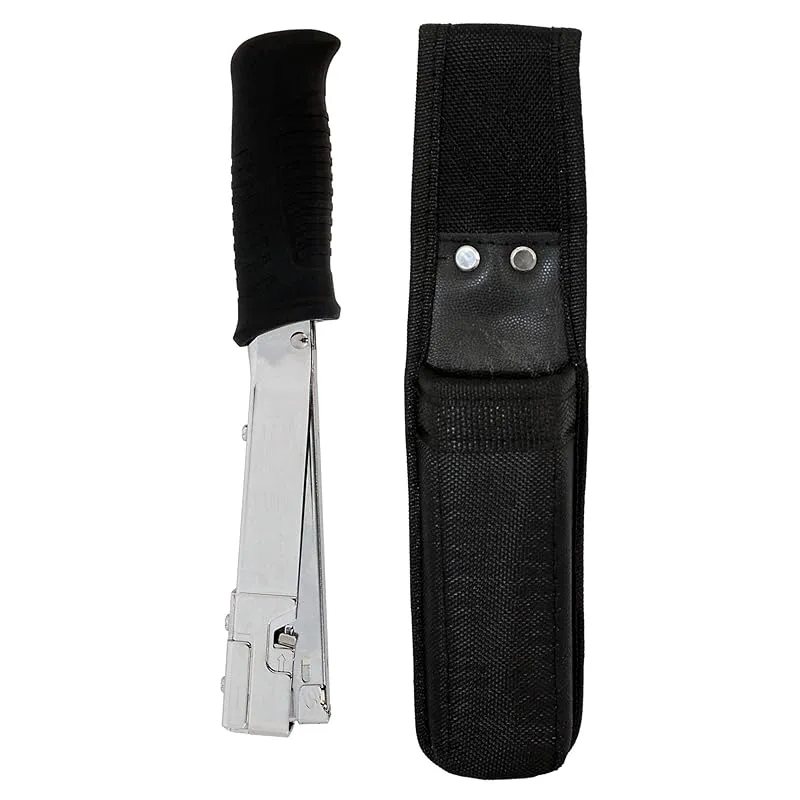 【商品概要】 特徴:普及率の高い肩幅12mmのステープルを採用しています。 特徴:専用サック付です。腰袋が干渉するような壁間の狭い現場での防水シート貼りなどで手返し良く作業出来ます。保管時の製品保護にも便利です。 用途:薄物材料の木材への固定作業全般 作業例:外壁防水シート、屋根ルーフィング、断熱材、ラス網等の取付けに。 適応ステープル:幅12mm×高さ6~10mm、充填本数144本