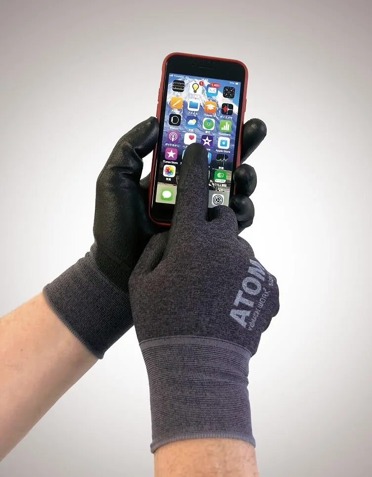 ナイロン18ゲージ編みで薄くて素手感覚の使い心地です。適度なグリップ効果のあるポリウレタン樹脂コーティング。親指・人差し指の2本はタッチパネル対応。