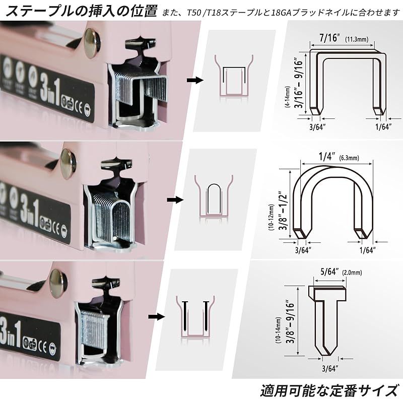 【商品概要】 ??3-in-1アプリケーション:Dタイプのステープル、Uタイプのステープル、Tタイプの爪など、3種類の異なるステープル/爪に適合します。一般的なモデルに適しています:T50、T18、ブラッドネイルゲージ18 より正確なポジショニング:ステープルガンは、3つの特定のステープルアウトレットレーザーエッチングマーキングを備えています。 ??ノブステップレス調整:高/低デュアルパワー調整とは異なり、ステップレスノブ調整により、より多くのレベルの電力調整が可能になります。これにより、ユーザーは、ステープルの目的の効果に応じて異なる圧力を設定できます ??使いやすく快適なもの:スタックステープルをすばやく除去できるジャムクリアリングシステムを装備しています。それはアンチスリップの快適さのグリップであり、ユーザーの手のひらにも快適さを与え、重い/継続的な仕事をしながら痛みを軽減します ??費用対効果の高いキット:すべての金属3-in-1ステープラーガン、3000個のPCSステープル、主食が含まれます。 1000 PCを含む5/16 "Dタイプのステープル、1000 PCS 15/32" U-Typeステープル(T18); 1000 PCS 25/64 "Tタイプのステープル(Brad Nail Gauge 18)。セットはあなたの最もニーズを満たします ??多種多様なアプリケーションに最適な:一般的なDIYの修理、クラフト、装飾、室内装飾プロジェクト、屋根など ??該当するステープルのサイズ範囲:Dタイプ(T50):3/16-9/16インチ。 uタイプ(T18):3/8-1/2インチ。 Tタイプ(Brad Nail Gauge 18):3/8-9/16インチ