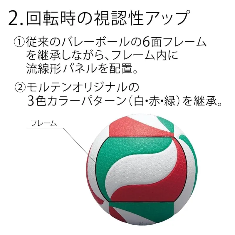 【商品概要】 円周/62~64cm 1.コントロール性能がアップ ボールに接する空気の乱れを抑制、従来コントロールするのが難しかったサーブ落下点のばらつきを低減します。 2.ボールの感触が柔らかくなり、レシーブの正確性アップにつながります。 3.従来の6面フレームを継承しながら、フレーム内に流線型パネルを配置する事でボールの回転がさらになめらかに見えるようになり視認性をアップさせます。 貼り・人工皮革4号球(軽量)