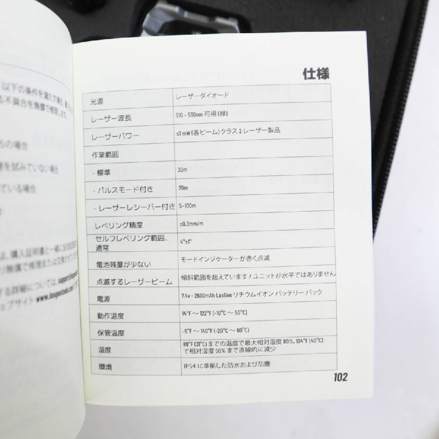 ●セルフレベリング&マニュアルモード:振り子がロックされていない場合、レーザーレベルは4度以内でセルフレベリングし、4度を超えるとレーザーが点滅し続けます。マニュアルモードに切り替えるには、振り子をロックし、異なる角度から位置合わせを行う必要があります 万が一の動作不良につきましては、商品到着後8日以内にご連絡いただければ初期不良対応いたします。 (ジャンク販売のお品・ランプやインク、フィルター、パッキン、バッテリーなどの消耗品、購入物以外に別途購入したパーツ、消耗品、設置や撤去に伴う工事等で発生した費用、直接お渡しの際に発生した交通費や送料など、このお取引について弊社がお客様からお預かりした金額以外は補償対象外です。) お品物の内容、状態、付属品、箱の有無等は写真にあるものが全てとなります。 写真に載っていないものは付属しません。 あらかじめご確認の上ご購入ください。よろしくお願いいたします。 310v28