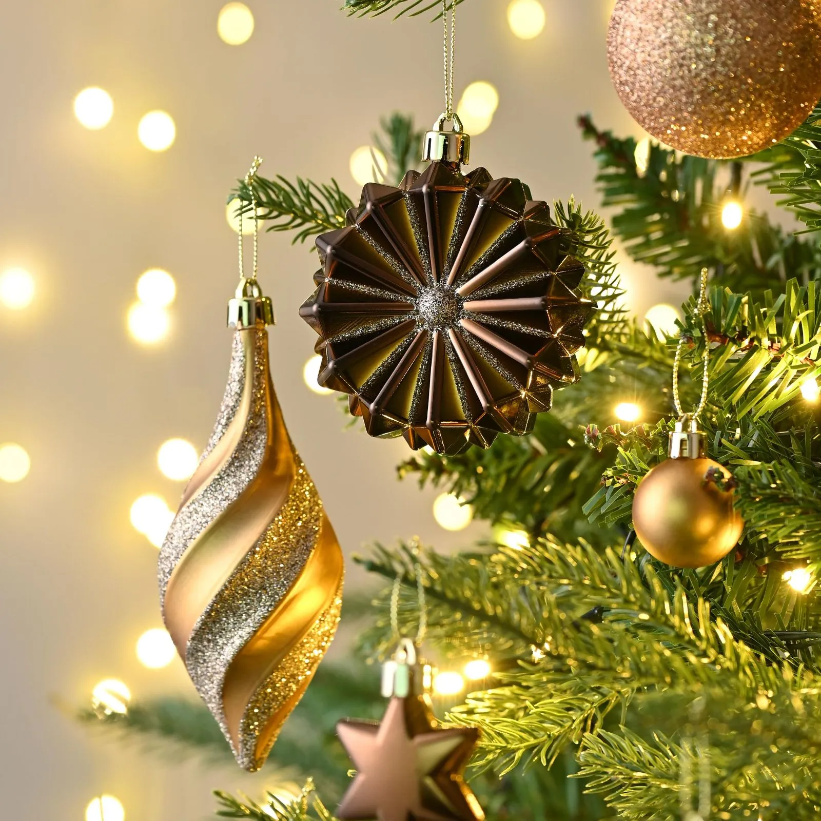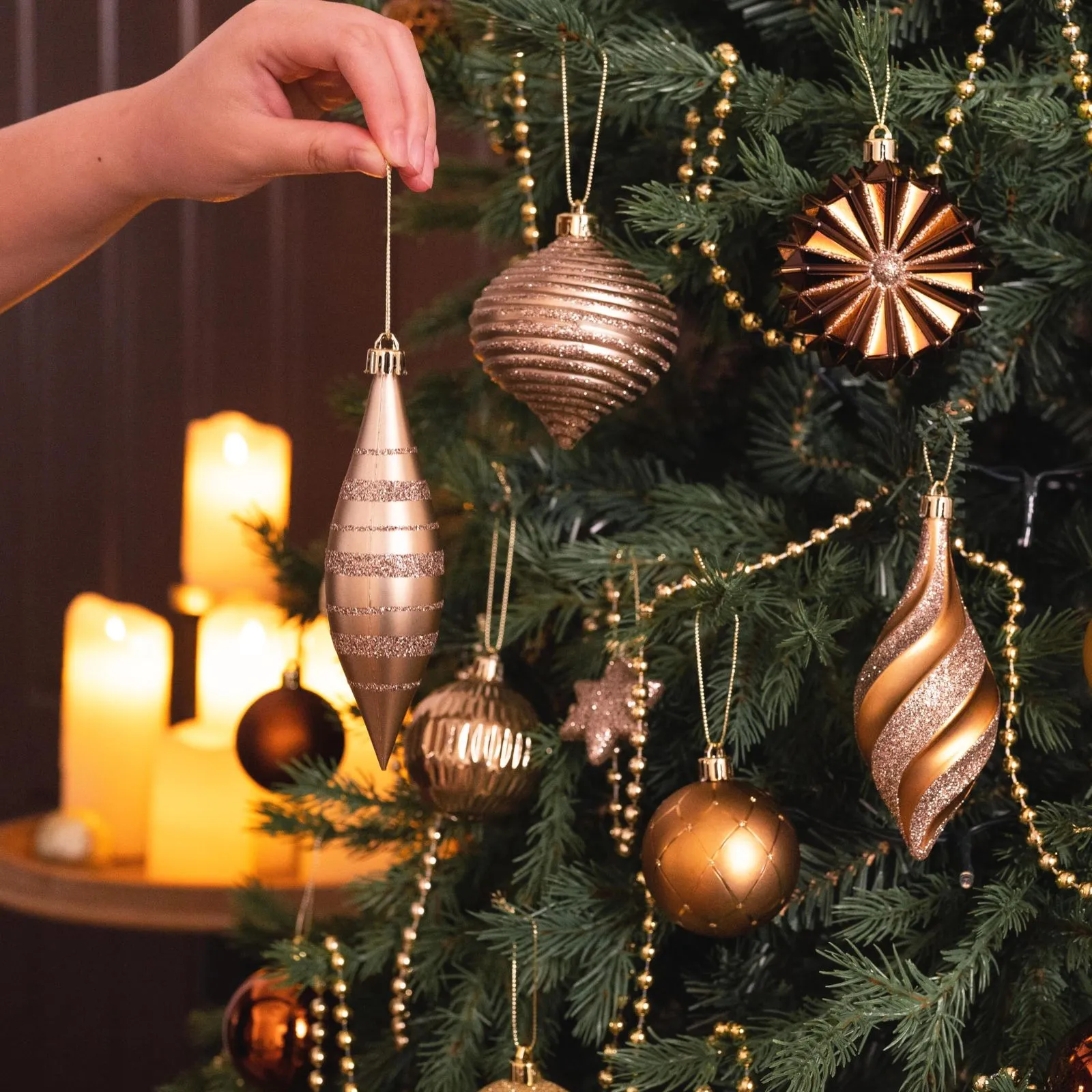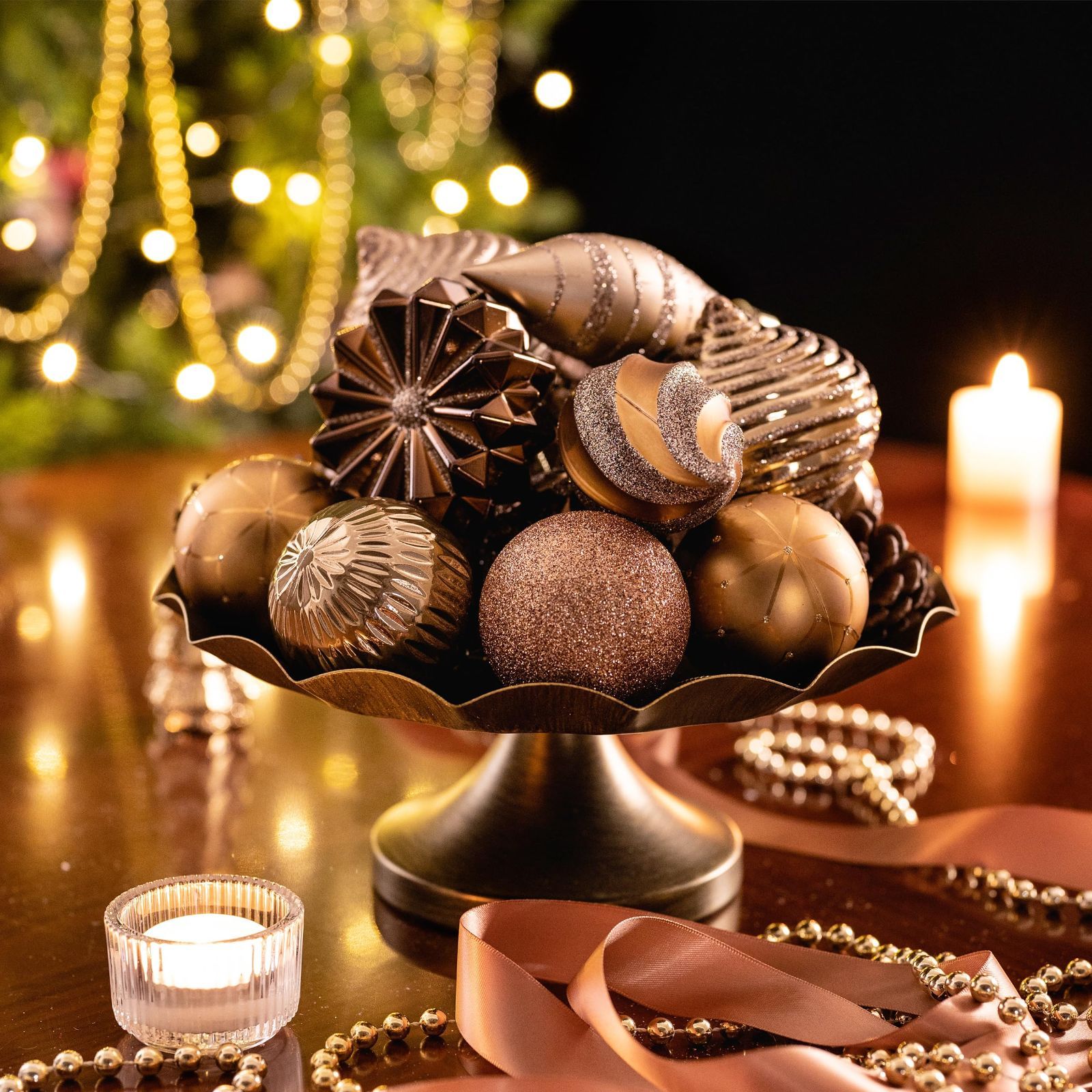 【色合わせ】クリスマスボールオーナメントは3つの独特な表面処理(光沢、マット、グリッター)を施されます。表面には異なる精緻なテクスチャがあります。それぞれのボールは丹念に吹き込まれ、手作業で塗装されています。銅色と金色があなたの家にラグジュアリーな雰囲気をもたらします。