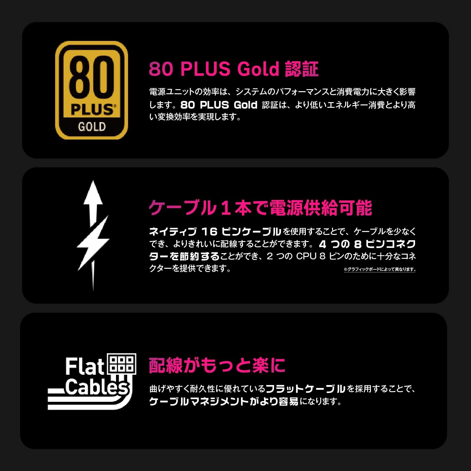 5.0に対応しており、12VHPWRコネクタを標準搭載。次世代のグラフィックボードにも十分な電力を供給することが可能です。奥行き150mmとコンパクトなサイズで様々なケースで組み込み可能です。フルモジュラー式スリーブケーブルを採用し、ケース内のケーブルの配線を美しく魅せることが可能です。100%日本メーカー製コンデンサを採用し、10年間の長期製品保証を実現しました。