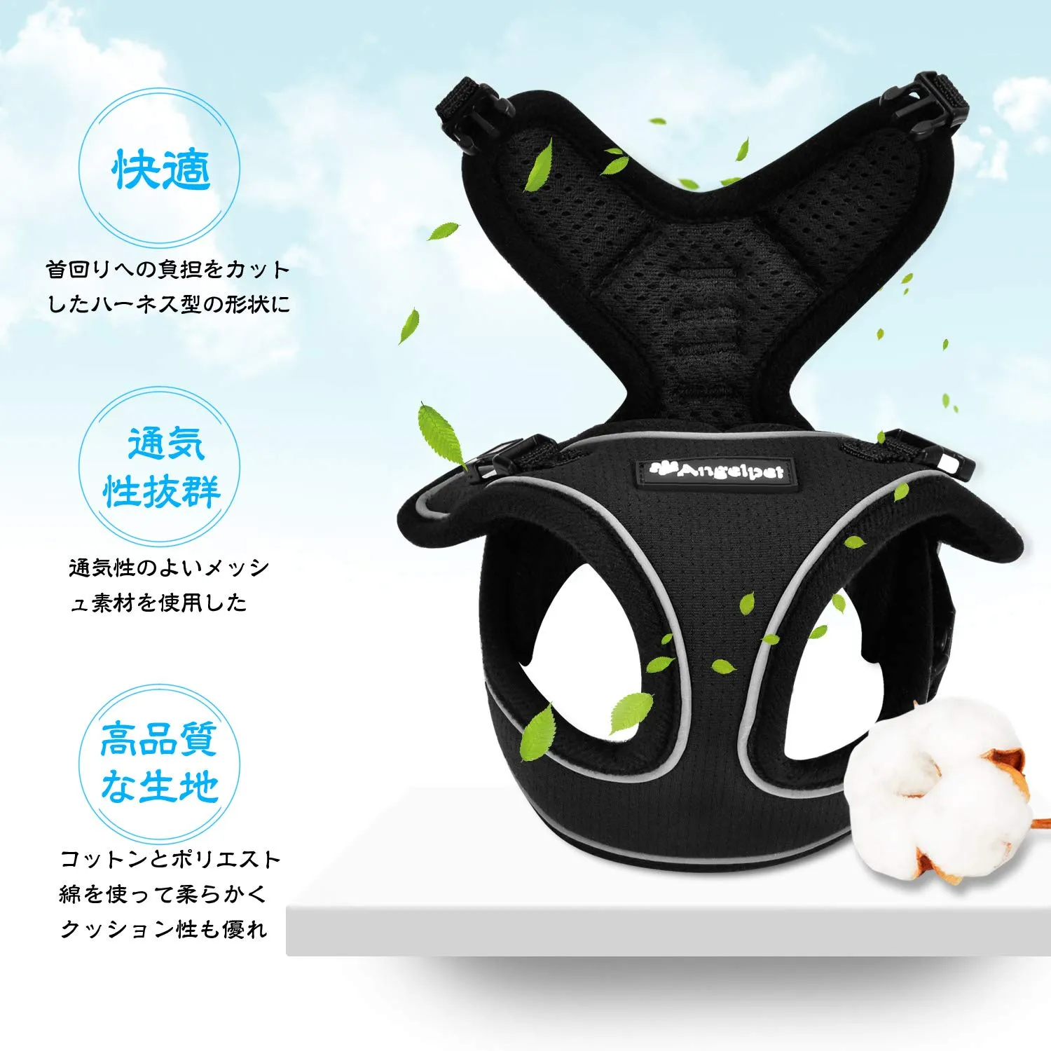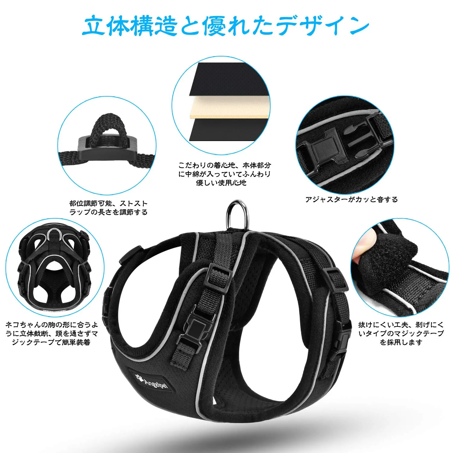 【耐久性と夜使用安心】背中のDカンは亜鉛合金製なので、耐久性が優れています。 背中の縁どりに3M超反射素材が付いて機能的。夜で歩道を歩く人には知らせ、車や自転車のライトには反射が光るから猫ちゃん、ワンちゃんとより安全にお散歩できます。