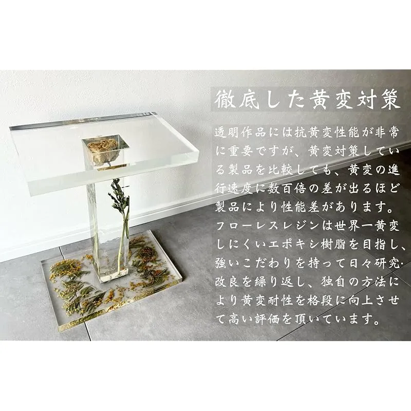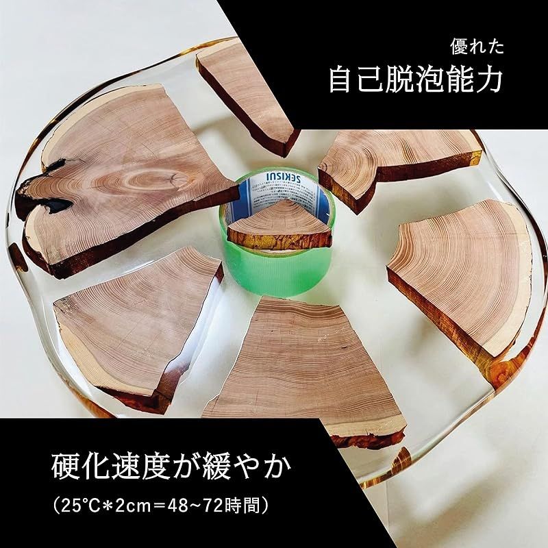 【商品概要】 最適な用途 :レジンテーブル、オブジェなどの大きな作品。 標本などの黄変させたくない無色透明の作品など。 ※エポキシ樹脂は硬化時間が長いと表面にシワ模様が発生しやすくなります。更に厚みが薄い、室温が低い、シリコンモールドが柔らかい事なども要因となります。研磨仕上げしない作品の場合は、硬化後・脱枠前に硬化の速いエポキシ樹脂で天面をコーティングするとシワ模様を消すことが出来ます。 混合比率(重量比):主剤