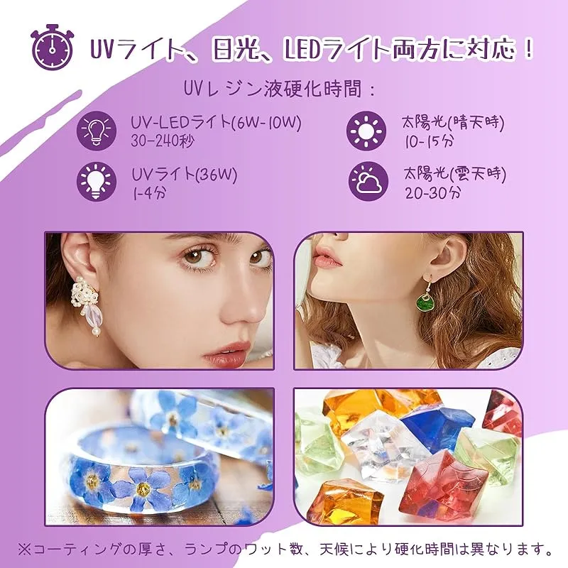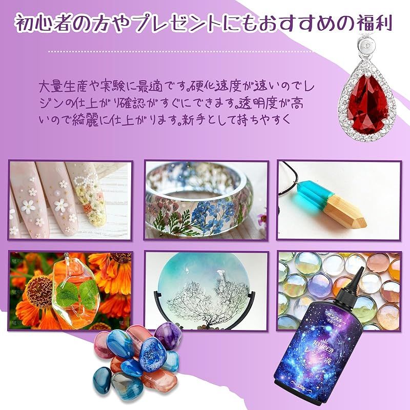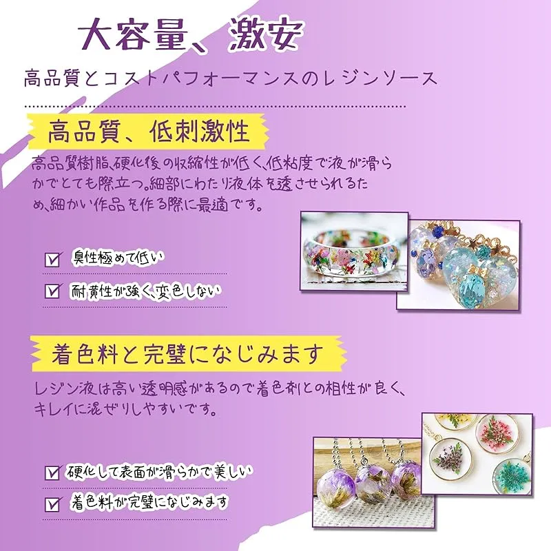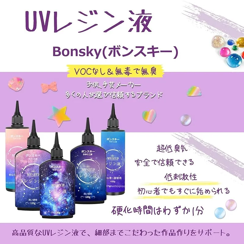 【商品説明】 Bonskyは10年以上のレジン液の製造経験を持っています。高光沢のレシピにより、完全に透き通った装飾面を硬化させ、磐石のように硬くし、傷や黄ばみに耐えることができます。揮発性有機化合物は全くありません。BPAを含まず、燃えにくいです。お客様は安心してお使いいただけます! 透明感:着色剤や小物パーツとの相性も良く、とてもきれいです!不純物がほとんど見えません! 変色しにくく黄色くなりにくいです:他のレジン液より、Bonskyレジン液は長持ちし、黄色くなりにくいです。注:長年の劣化や使用環境などにより、樹脂特有の変色があります。 硬化に要する時間が短い:UV-LEDで硬化できます。時間は最大30秒(使用ランプのワット数と電力による)です。太陽光が照射されても、硬化することができます。経験者も初心者も簡単に操作できます。制作プロセスをより楽にして安心させます。 操作手順:1.キャップをひねって、封口(専用の封口で、漏れ防止のため)を開けます2.計量カップに注ぐぎます。お客様の好みの色やアクセサリーを加えて、均一にかき混ぜることができます。3.型に流し込みます。36WのUVランプや日光で2~4分で硬化します。 次の点にご注意ください: 1.換気環境下で操作を行うべきです。2.使用後、キャップを密封し、日陰に置いて日光が当たらないようにしてください。3.子供の手の届かないところに置いてください。不注意で肌に付着した場合は、すぐに洗い流してください。
