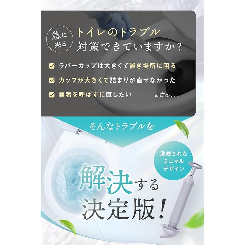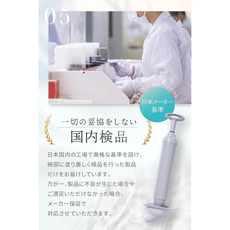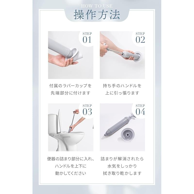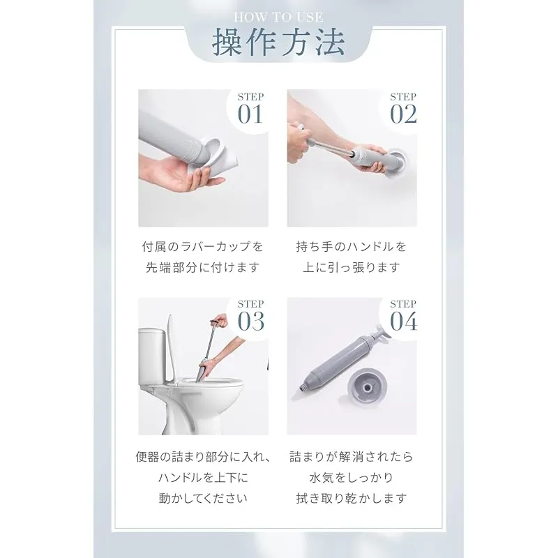 【真空式ポンプ】真空ポンプ方式で水を吸引し、排出するため、従来のすっぽん(ラバーカップ)に比べて5倍の吸引力があります。失敗が少なく、効果的に詰まりを解消します。加圧式ハンドルが付いており、押すことと引くことの2段階方式で使います。女性でも簡単に操作でき、使い方が簡単で、誰でもすぐに使い始めることができます。