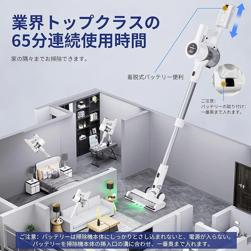 【65分長時間連続稼働&大容量着脱式バッテリー】手軽さと充実のお掃除性能を両立したコードレス掃除機は、進級版大容量着?式バッテリーを採用し、一回満充電後は最大65分間の連続使用が可能!コードレス掃除機で家全体を一気に掃除できる!急速充電、約4時間でフル充電でき。サイクロン掃除機の予備バッテリー(別売り)を使えば、稼働時間倍増し、1DKのひとり暮らし家から、一戸建ての家まで一気に掃除できます。 また、着?式バッテリーなので単独で充電することも、本体に取り付けたまま充電することもできます。このスティッククリーナーは3つの充電方法があり、非常に便利! ???