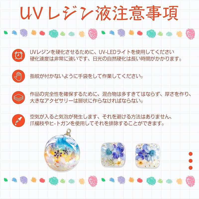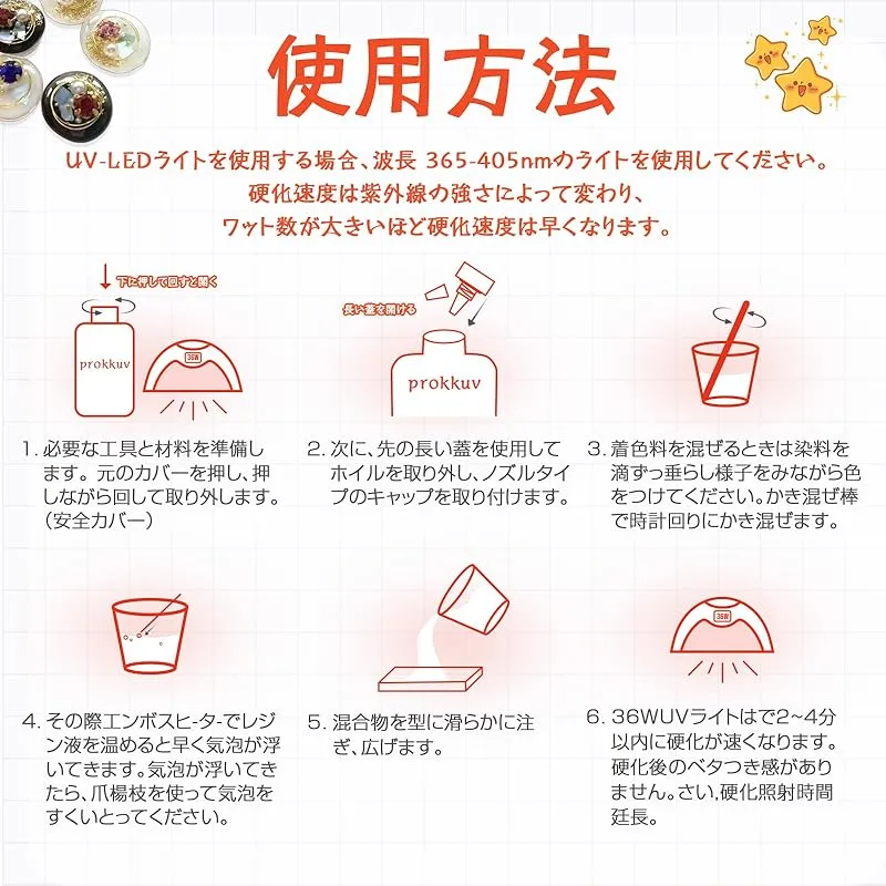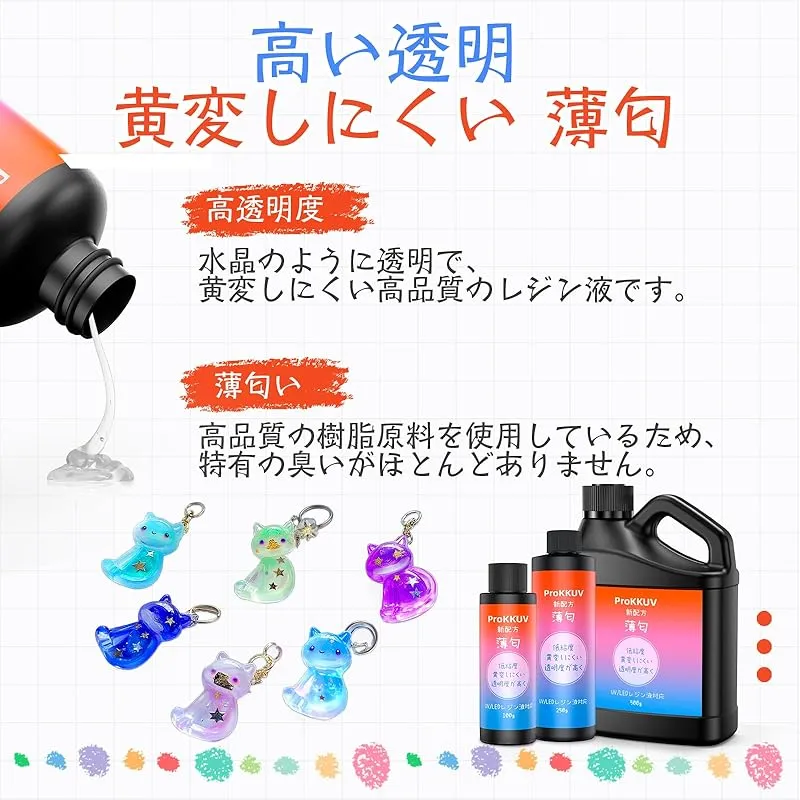 【商品概要】 高品質のUVレジン液と黄変しにくい:透明性と硬度に優れた高級UVレジン液で、水晶のようなクリアさと薄匂いを持ち、黄変を防止します。環境に優しい材料を使用しており、安全にご使用いただけます。 使いやすく、急速に硬化する:混合カップにUVレジン液を注入し、お好みのスパンコールやデコレーションなどのフィラーを加えることで、美しさと豊かさを引き立てます。型から取り出し、UVライトで2?4分間表と裏を硬化させます。 無臭で気泡が少ない:使用時にはわずかな匂いがありますが、硬化後は無臭になります。型に注ぎ込んだり、ジュエリーに塗布したりする際、わずかな気泡が発生した場合は、スティックの先でカットするか、ライターで焼くことができます。6Wランプを使用する場合は、点灯時間を長くして両側を照らす必要があります。そうしないと乾燥しません。 ProKKUV UVレジン液は、初心者の方にも安心してお使いいただけます。詳細な技術ガイドブックもご提供しておりますので、気泡を避ける方法や硬化効果を高める方法などの専門知識を簡単に学ぶことができます。家族、友人、同僚などへの贈り物としても最適です。 安心と優れたサービス:開封後は密閉して暗所に保存し、直射日光を避けてください。商品に何か問題がある場合は、いつでもお気軽にご連絡ください。弊社チームは迅速かつ高品質なカスタマーサポートを提供いたします。