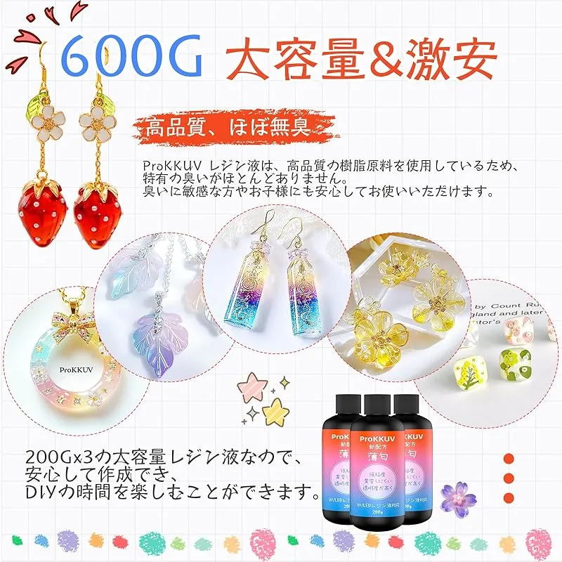 ProKKUV レジン液 200gX3 大容量 UV/LED対応 UVレジン液 新パッケージ 薄匂 UVレジン 透明度が高く レジン黄変しにくい クリスタルクリアで 急速硬化 低粘度 初心者向け キラキラ レジン着色剤封入素材付きDIY手作り 0