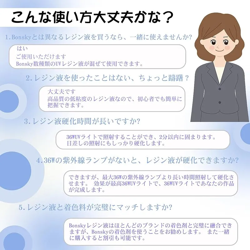 【商品説明】 Bonskyは10年以上のレジン液の製造経験を持っています。高光沢のレシピにより、完全に透き通った装飾面を硬化させ、磐石のように硬くし、傷や黄ばみに耐えることができます。揮発性有機化合物は全くありません。BPAを含まず、燃えにくいです。お客様は安心してお使いいただけます! 透明感:着色剤や小物パーツとの相性も良く、とてもきれいです!不純物がほとんど見えません! 変色しにくく黄色くなりにくいです:他のレジン液より、Bonskyレジン液は長持ちし、黄色くなりにくいです。注:長年の劣化や使用環境などにより、樹脂特有の変色があります。 硬化に要する時間が短い:UV-LEDで硬化できます。時間は最大30秒(使用ランプのワット数と電力による)です。太陽光が照射されても、硬化することができます。経験者も初心者も簡単に操作できます。制作プロセスをより楽にして安心させます。 操作手順:1.キャップをひねって、封口(専用の封口で、漏れ防止のため)を開けます2.計量カップに注ぐぎます。お客様の好みの色やアクセサリーを加えて、均一にかき混ぜることができます。3.型に流し込みます。36WのUVランプや日光で2~4分で硬化します。 次の点にご注意ください: 1.換気環境下で操作を行うべきです。2.使用後、キャップを密封し、日陰に置いて日光が当たらないようにしてください。3.子供の手の届かないところに置いてください。不注意で肌に付着した場合は、すぐに洗い流してください。
