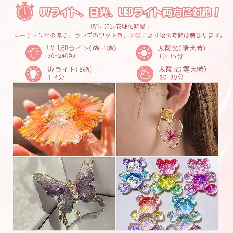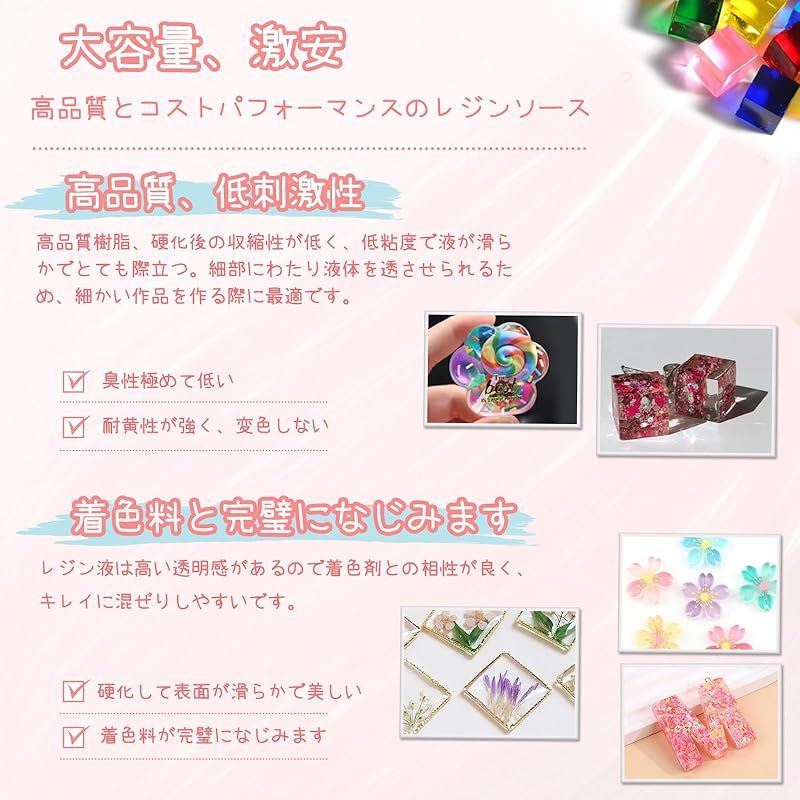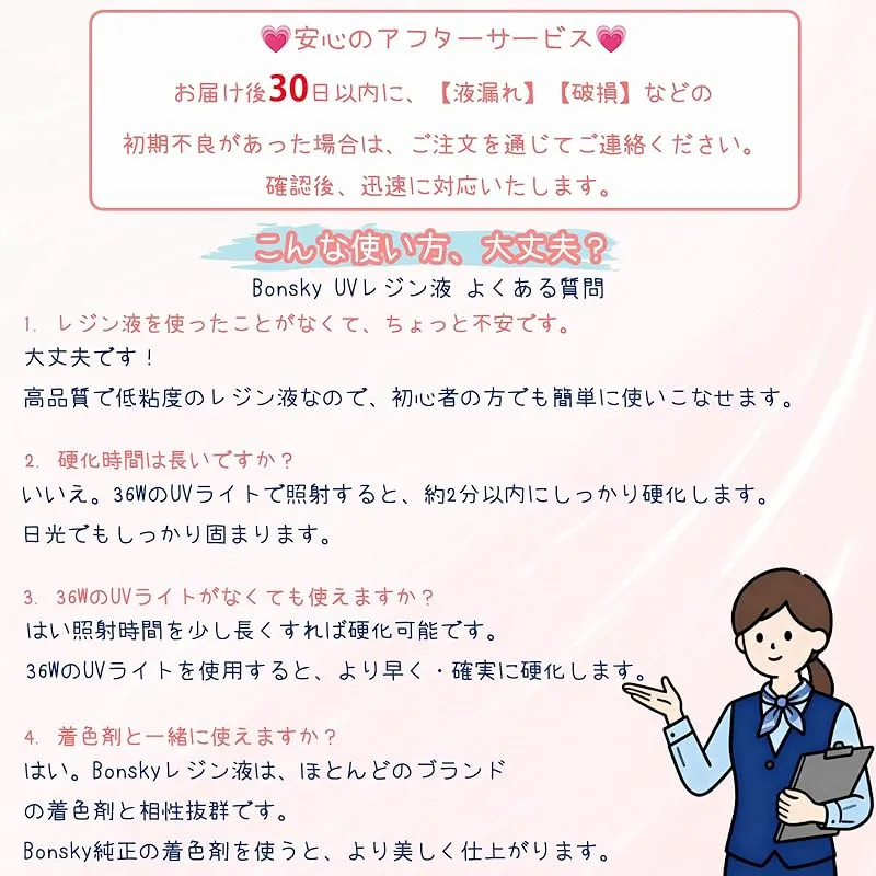 【商品説明】 Bonskyは10年以上のレジン液の製造経験を持っています。高光沢のレシピにより、完全に透き通った装飾面を硬化させ、磐石のように硬くし、傷や黄ばみに耐えることができます。揮発性有機化合物は全くありません。BPAを含まず、燃えにくいです。お客様は安心してお使いいただけます! 透明感:着色剤や小物パーツとの相性も良く、とてもきれいです!不純物がほとんど見えません! 変色しにくく黄色くなりにくいです:他のレジン液より、Bonskyレジン液は長持ちし、黄色くなりにくいです。注:長年の劣化や使用環境などにより、樹脂特有の変色があります。 硬化に要する時間が短い:UV-LEDで硬化できます。時間は最大30秒(使用ランプのワット数と電力による)です。太陽光が照射されても、硬化することができます。経験者も初心者も簡単に操作できます。制作プロセスをより楽にして安心させます。 操作手順:1.キャップをひねって、封口(専用の封口で、漏れ防止のため)を開けます2.計量カップに注ぐぎます。お客様の好みの色やアクセサリーを加えて、均一にかき混ぜることができます。3.型に流し込みます。36WのUVランプや日光で2~4分で硬化します。 次の点にご注意ください: 1.換気環境下で操作を行うべきです。2.使用後、キャップを密封し、日陰に置いて日光が当たらないようにしてください。3.子供の手の届かないところに置いてください。不注意で肌に付着した場合は、すぐに洗い流してください。