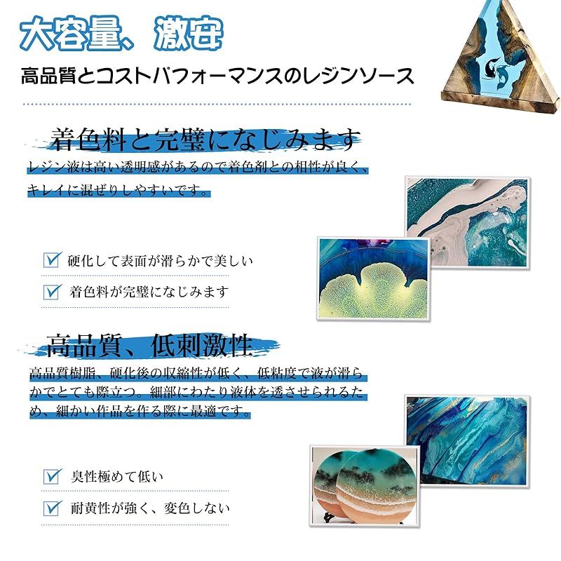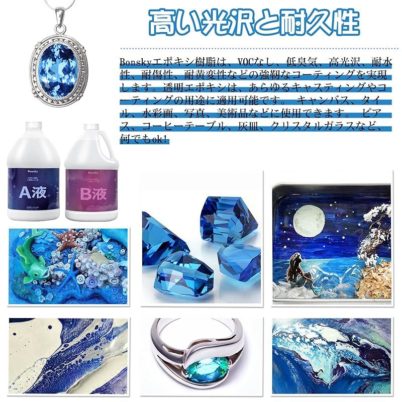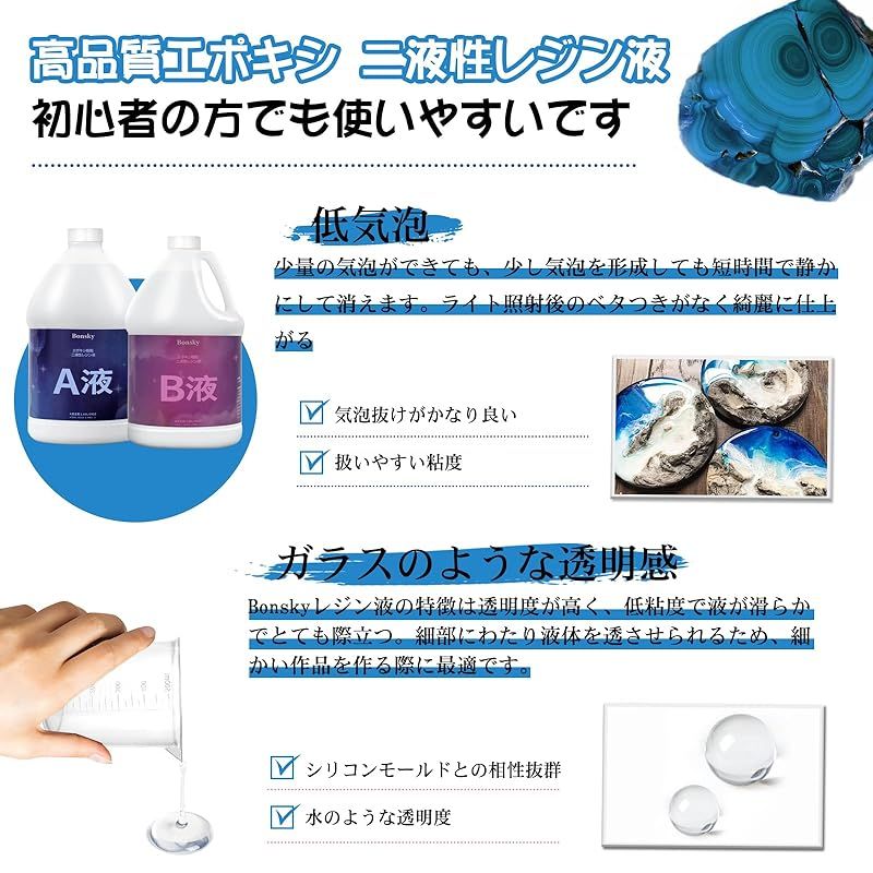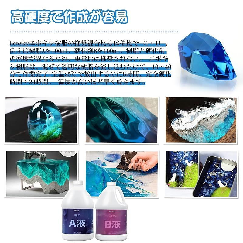 【商品概要】 2液性レジン液大容量/高品質:高品質ハードタイプ 2液性エポキシレジン 大容量 激安 容量1.89L+1.89L、配合比は1:1。二成分樹脂液は、二種類の液体を混合して化学反応により硬化させた樹脂であり、「エポキシ樹脂」とも呼ばれる。UVレジン液とは異なり、紫外線に曝す必要はなく、特殊な工具や機械を必要とせず、時間とともに硬化します。 黄変くなりにくい/適用範囲が広い:エポキシ樹脂は透明度が高く、エポキシ樹脂は低収縮性、立体的な造型ができ、様々なシチュエーションで抜群の透明感と光沢を演出します。樹脂モールド、キラキラ、顔料、染料、アルコールインクに使用できます。アートジュエリーのDIY工芸品を作るのにも最適です。工芸品の装飾、鋳造、絵画、人形作りなど。 自然脱泡性と着色剤との相性が抜群:気泡が少なく、低粘度のエポキシ樹脂なので、気泡を早く排出することができます。撹拌後3-5分放置することで自然に気泡が消えます。 エポキシレジン高い透明感だから着色剤もキレイに混ざって鮮やかな仕上がりになります。あなたの想像力を最大限に発揮してDIYの旅を始めましょう。 取扱い上の注意事項:A液とB液の混合比率は1:1(体積比)である。硬化に失敗しないように正確に測定してください。等量の液体AとBを取り、計量カップに入れます。(AとBは液体密度が異なり、同じ重量は同じ体積に等しくない)。注意事項:硬化時間は温度や湿度により異なります。20?25℃では、初期硬化には通常12時間、最終硬化には24時間かかる。微細気泡の発生を防ぐために、少なくとも3分間軽く撹拌する。 特別な注意:(Bonsky)と(ボンスキー)は同一ブランドです。現在パッケージデザインをリニューアルしておりますが、日本地域では(ボンスキー)ブランドを使用いたします。パッケージ内容:Bonsky(ボンスキー) A液 1.89L/64OZ*1、B液 1.89L/64OZ*1、計量カップ*3、手袋とかき混ぜ棒ツールのセット*1。ご質問がございましたら、お問い合わせください。