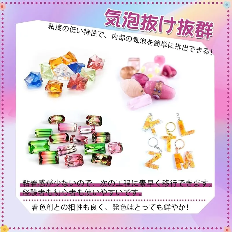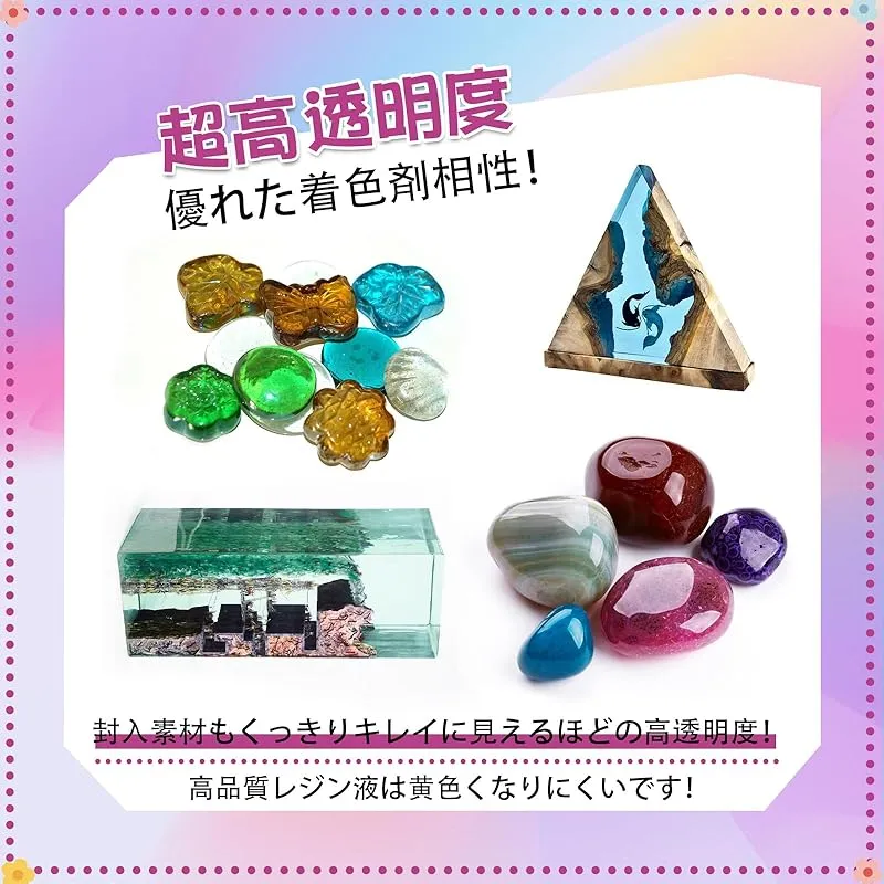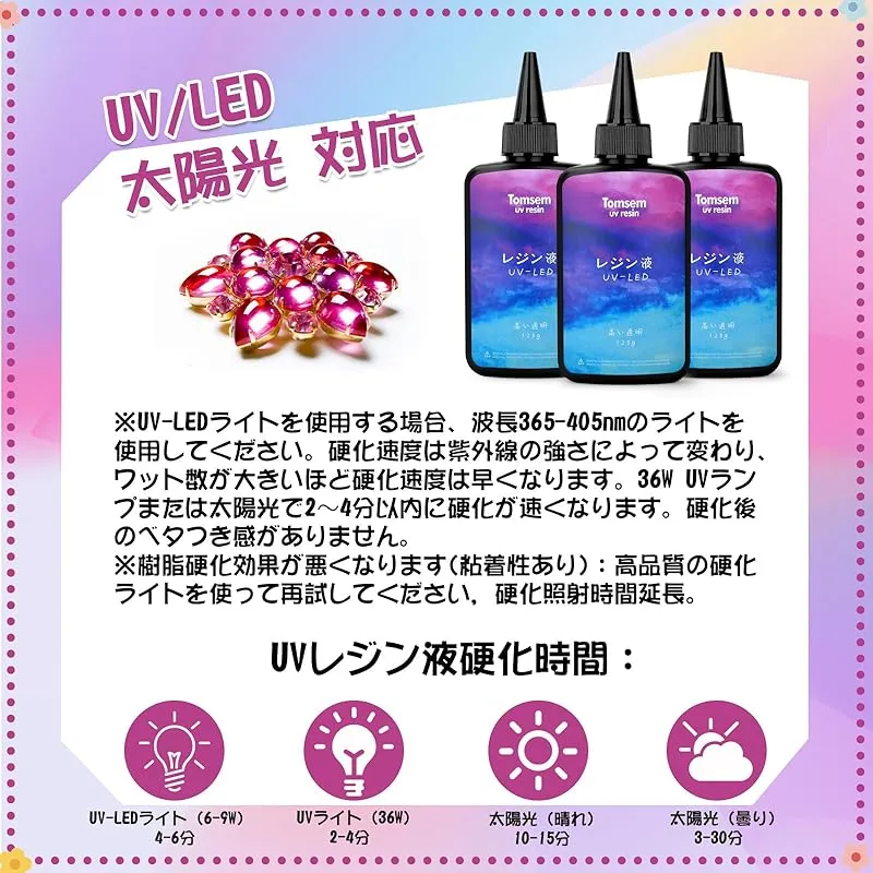 【商品概要】 UV-LED対応と急速硬化:最新樹脂仕様、硬化時間が短い。UVレジン液は紫外線ランプやLEDランプと組み合わせて使用できます。太陽光でも簡単に液体を硬化させることができます。経験者も初心者も使いやすいです。 レジン液の高透明感:ガラスのような透明感が、固まったら長い時間でも黄変しない。着色剤との相性も良く、発色はとっても鮮やか! 硬化後、透明度も高く、綺麗に仕上がる。そして時間が経つにつれて簡単に黄色くなることはありません。 高品質レジン液:あなたがそれを作る時に、ほとんど気泡が全くありません。その匂いは低いです。 どんな環境でも作業できます。大容量 たくさんのものを作れます。保存は簡単、密封するだけ。 Tomsemレジン液:VOCなし&無毒で無臭、高品質で無害な素材で作られています、環境にもやさしいです。だから、安心して使える!アートジュエリーDIY工芸品の制作、金型鋳造、レジンコーティング、工芸品装飾、鋳造、コーティングなどに非常に適しています。観賞用の手作り品として使えます。 注: 照射には 36W 紫外線ランプを使用するのが最適です。ご不明な点がございましたら、お問い合わせください。