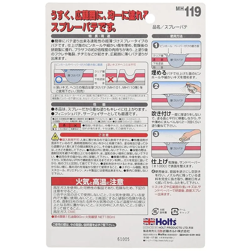 【商品詳細】 ブランド:Holts(ホルツ) 商品種別:車用ペイント補修パテ 商品名:ホルツ 補修用パテ 超薄付けスプレータイプ スプレーパテ 180ml Holts MH119 製造元:Holts(ホルツ) 商品番号:MH119 発売日:2012年11月09日 商品内容:単品