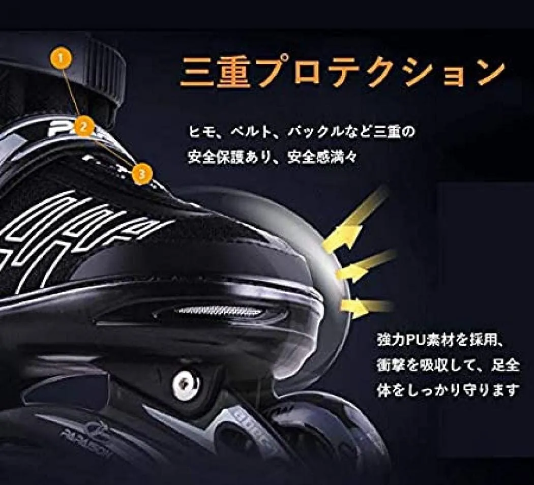 【安定性】一列四つのスケートの構造で、インラインスケートを順調に回すと同時に、スムーズな高性能スケート、静音性も優れ、摩擦抗性が少ない、順調に進みます、安全性、耐久性が優れ、長時間使用しても大丈夫です。インラインスケートの表面高強度衝突の対策を講じ、衝撃吸収材を使用し、振動を吸収し、安定感があり、楽にを楽しめます。