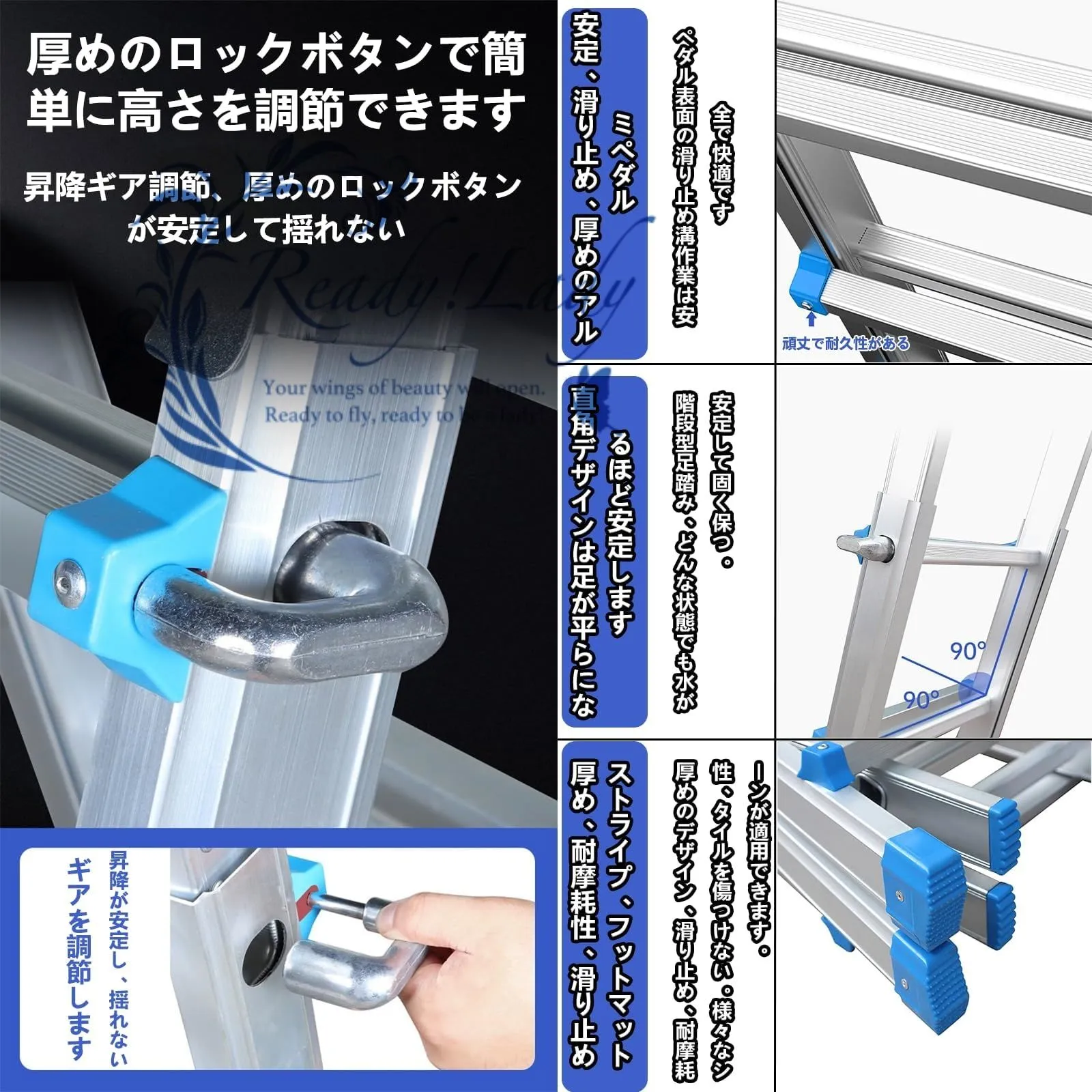 【滑り止め脚パッド】- はしごの脚パッドには拡大された滑り止めテクスチャがあり、より強力な摩擦力と安定性を提供し、より安全な作業体験を提供します。この特別なデザインにより、はしご上での歩行時の安定性とバランスが確保され、滑り落ちのリスクが減少し、より集中して安心してタスクを完了できます。